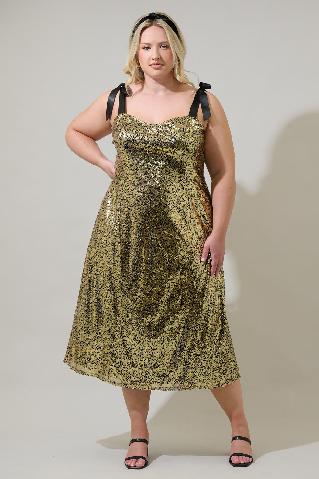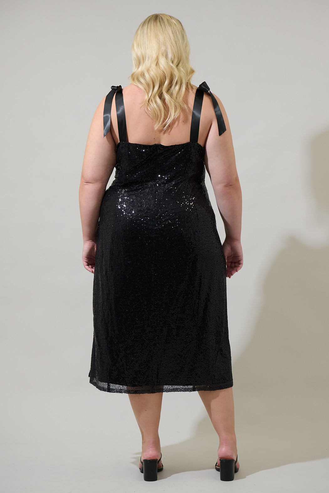 Add a pop of fun into your weekend wardrobe with this Adelisa Sequin Tie Strap Midi Dress. Shinny sequin fabric makes a sweet heart neckline with tying shoulder straps. The back has an invisible zipper and ends at a midi length. Pair it up with strappy heels.