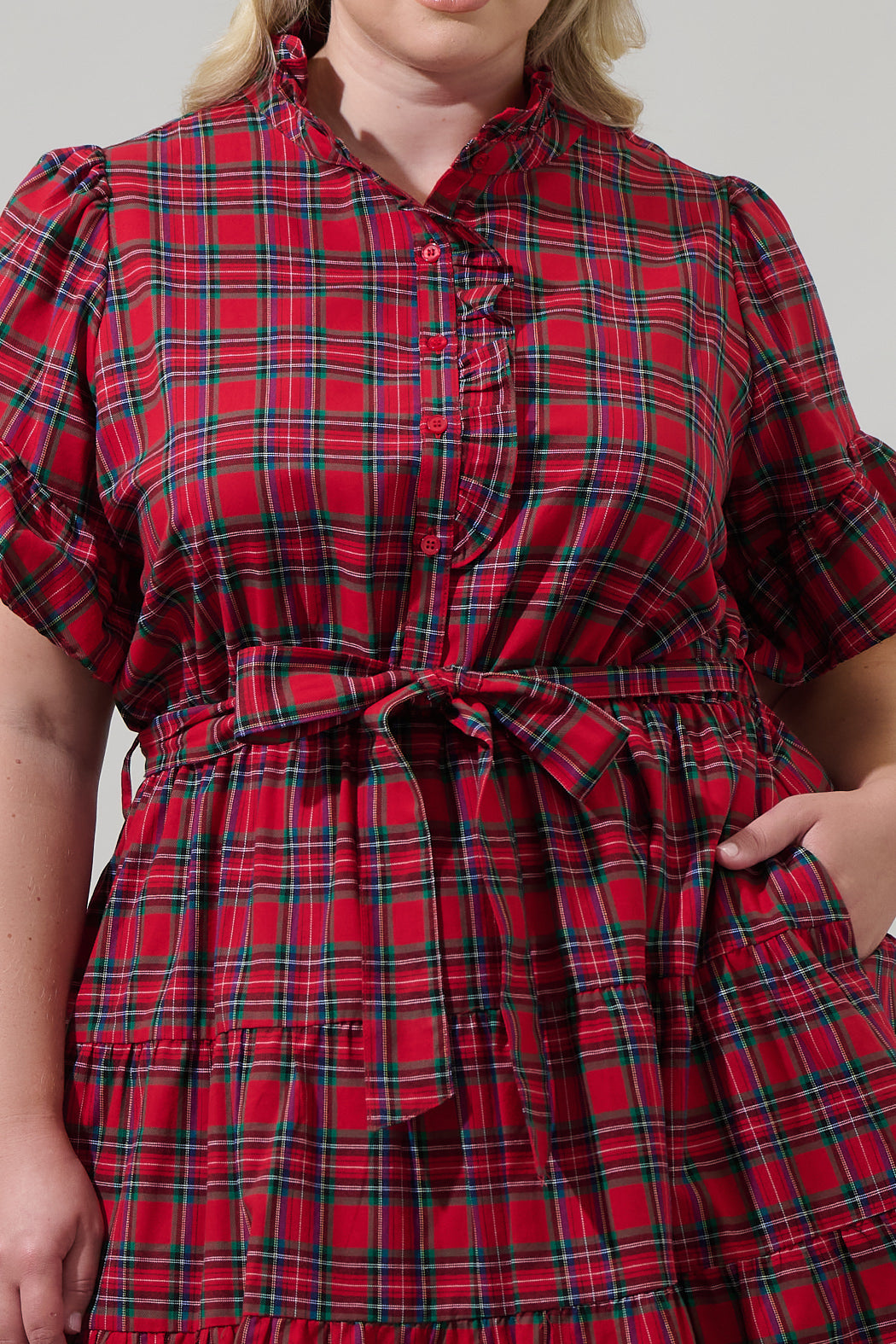 Perfect fall days start with the Arvada Plaid Cottonwood Ruffle Button Down Mini Dress. A red multi plaid pattern shapes this mini dress that has short sleeves, ruffles, belt around the waist, and a functional button placket at the front. Easy to pair with heels or boots.