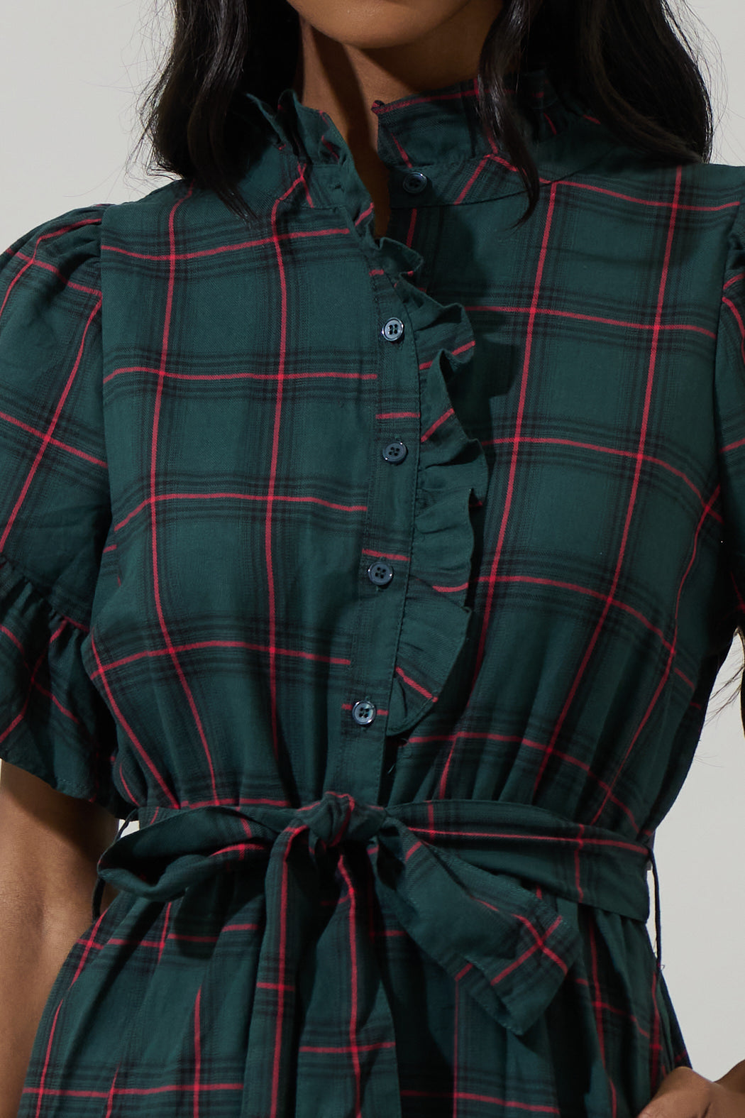 All your fall looks will be elevated this season with the addition of the Brook Plaid Cottonwood Ruffle Button Down Mini Dress. A green multi plaid pattern shapes this mini dress that has short sleeves, ruffles, belt around the waist, and a functional button placket at the front. Easy to pair with heels or boots.