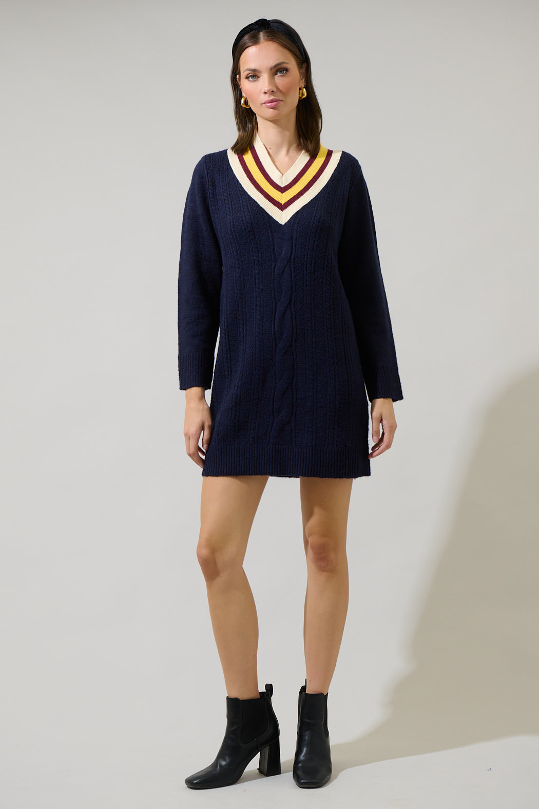 We love to keep cozy in this effortless Corunna V-Neck Mini Sweater Dress. A color block and striped v-neckline frames this long sleeve dress. A cable knit design enchants the middle front. Perfect to wear this cold season with high knee boots.