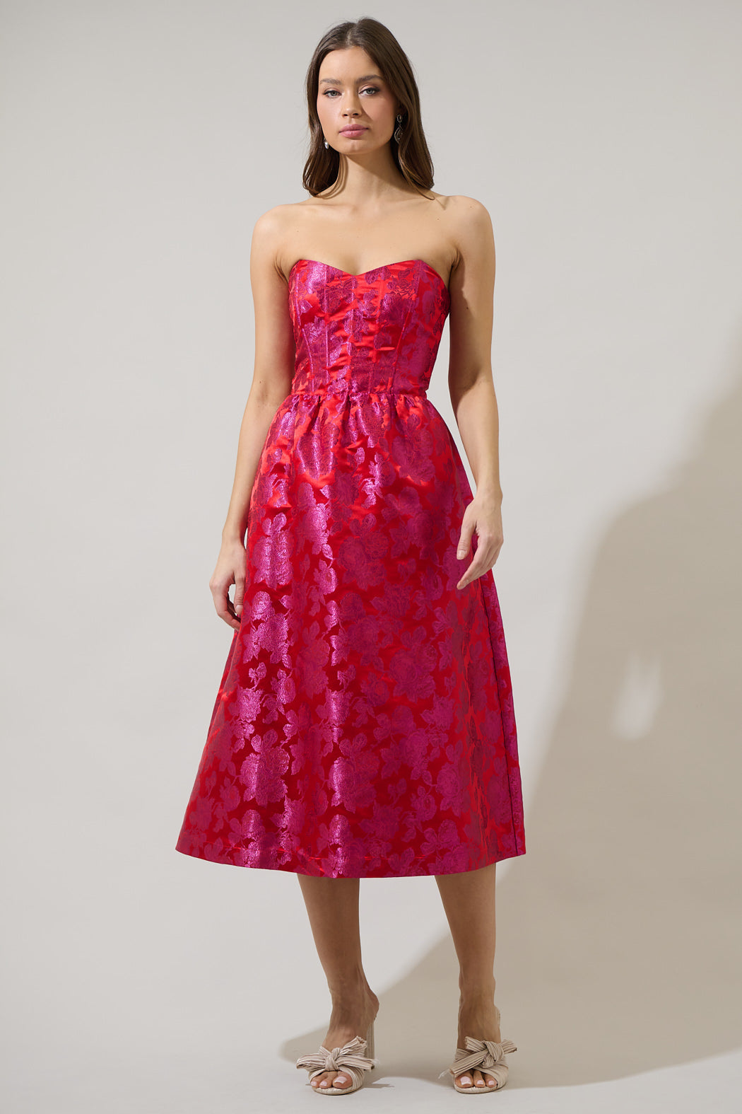 Take the stress out of weekend styling with this Duson Floral Bellar Strapless Midi Dress. It has a strapless sweet heart neckline with pearl rhinestones on the border and around the waist. The back is smocked. Wear it out to a night event with strappy heels.