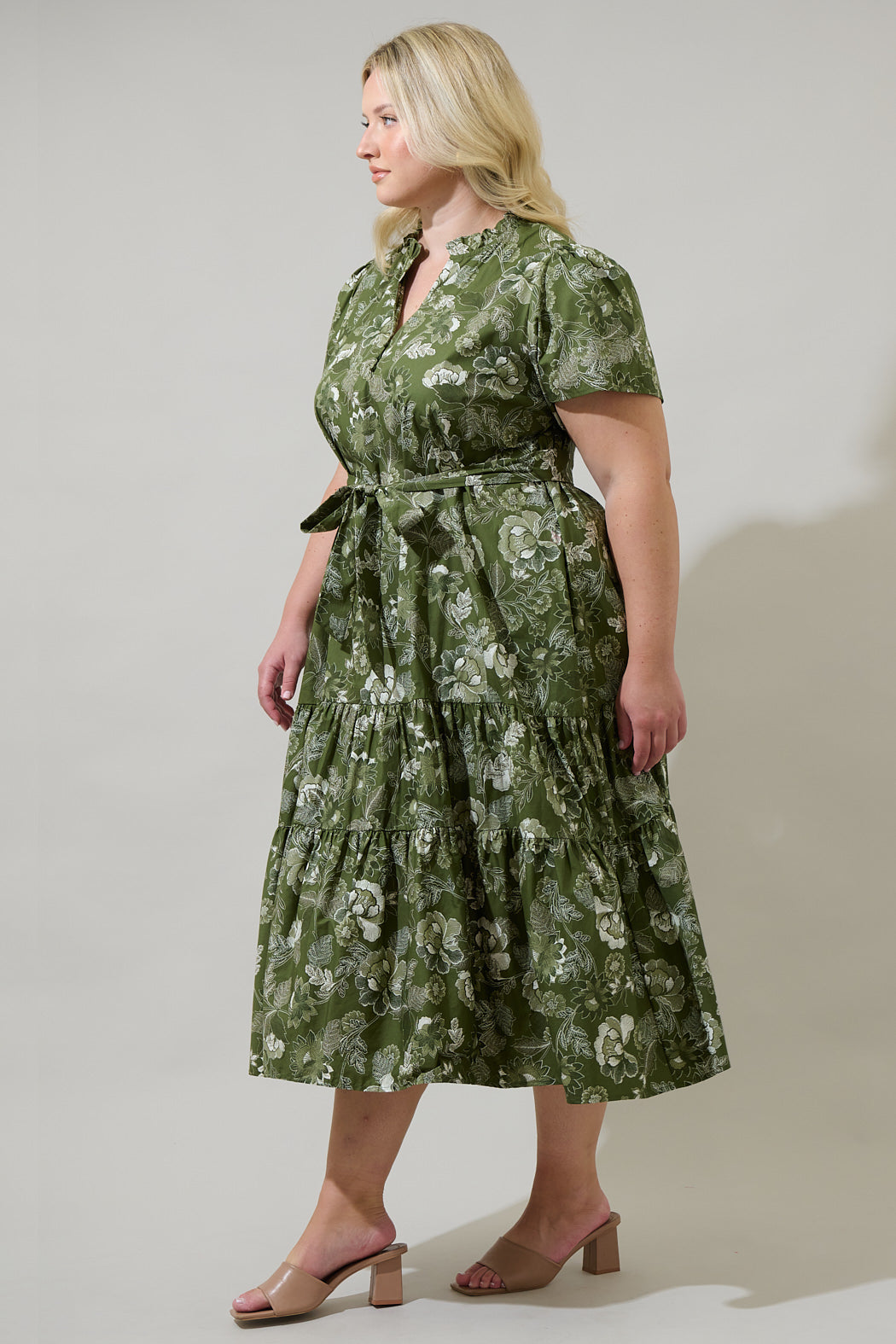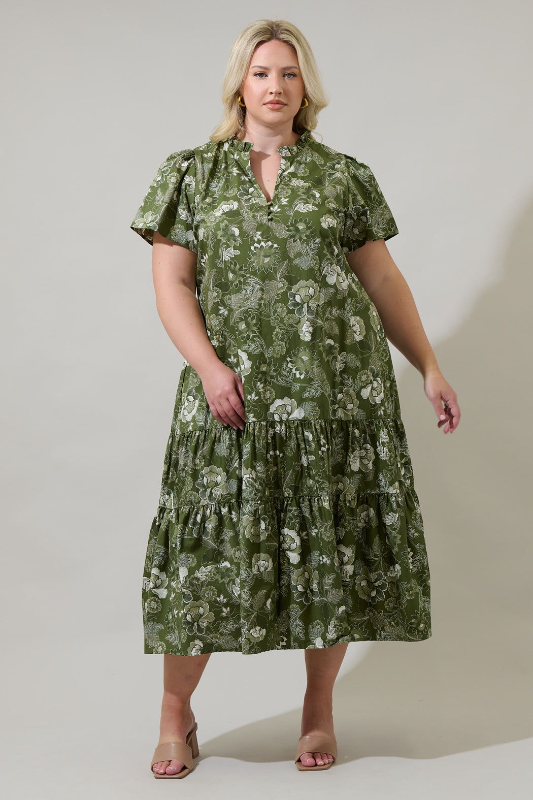 The Hazleton Floral Britt Poplin Tiered Midi Dress is one of kind. This midi dress has short sleeves that frame a split neckline with ruffles around and a lower button up detail. It has belt around the waist and tiered layers. You can easily style it with wedges or strappy heels.