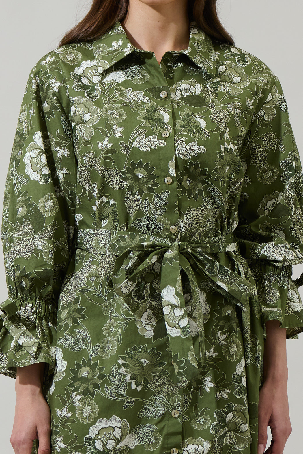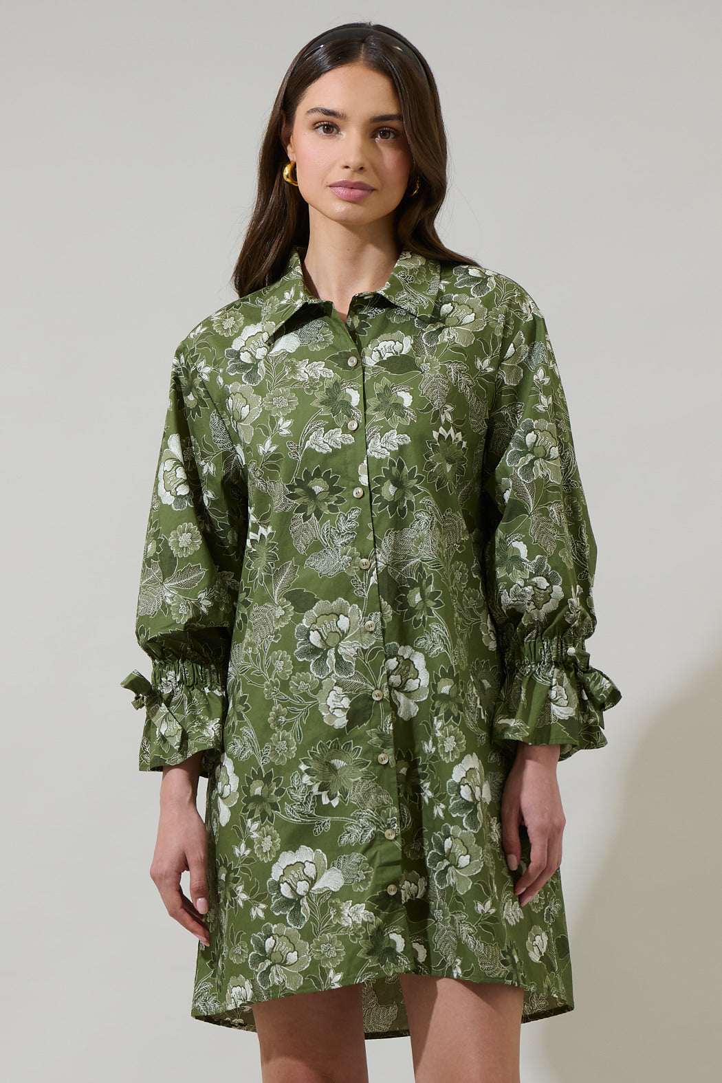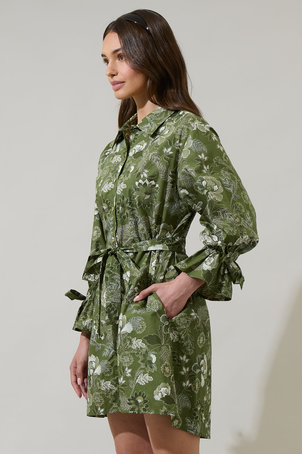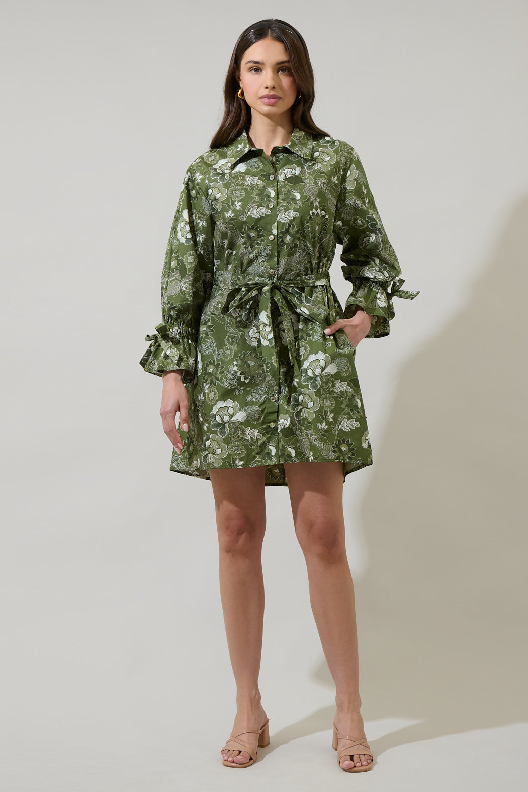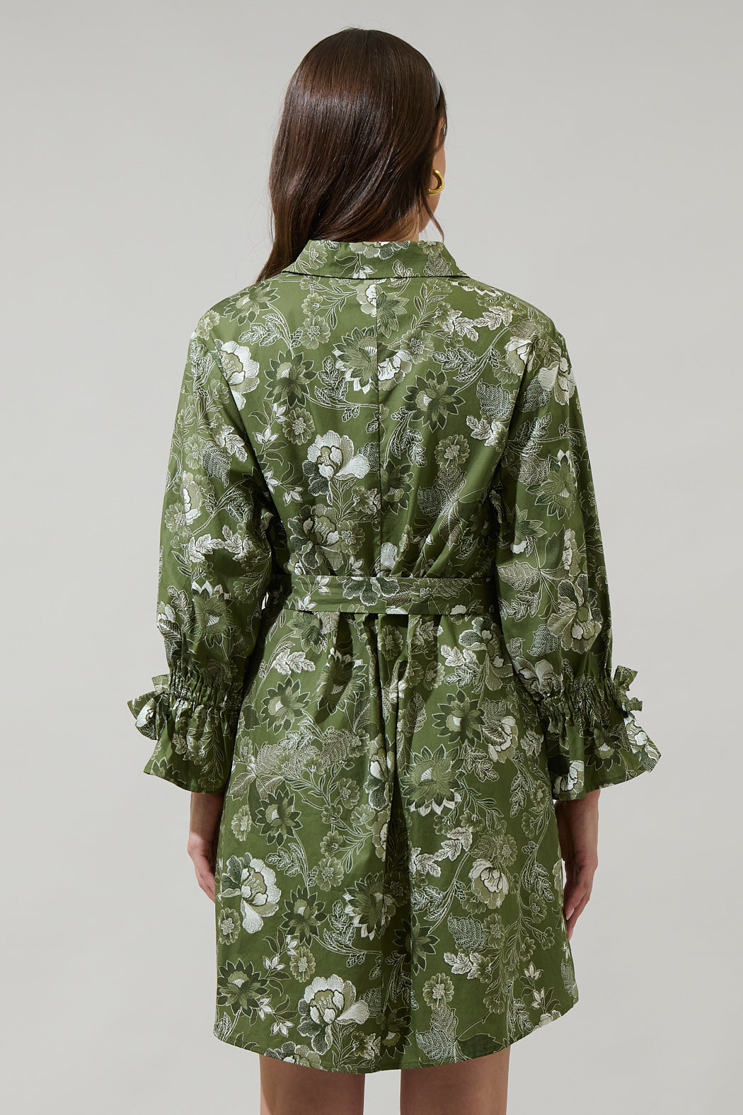 Head out for the day looking absolutely cute in the Hazleton Floral Emelia Button Up Mini Dress. Green florals adorn this beauty. Long sleeves frame this mini dress with a belt around the waist and a collared neck. It goes perfectly with white heels.