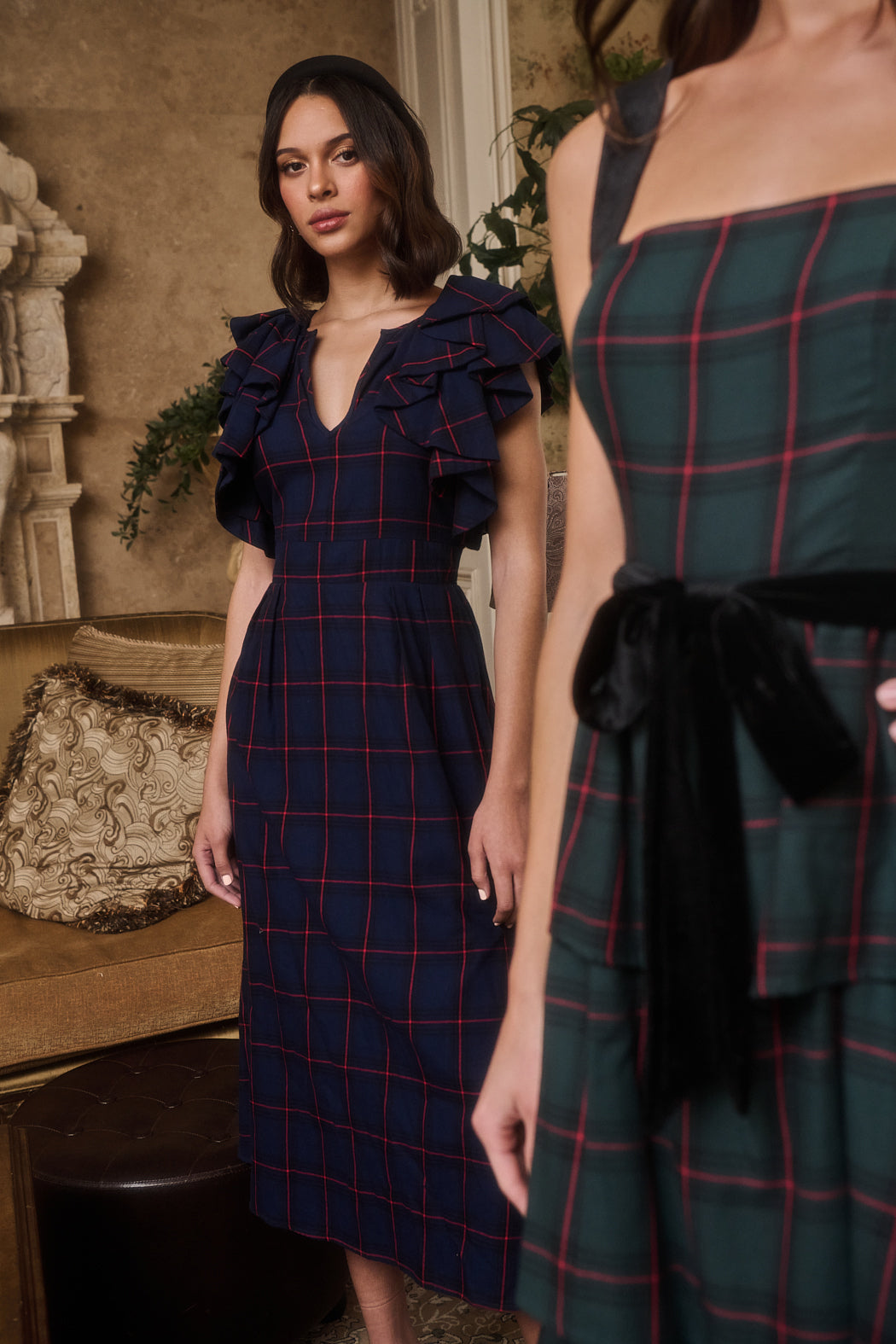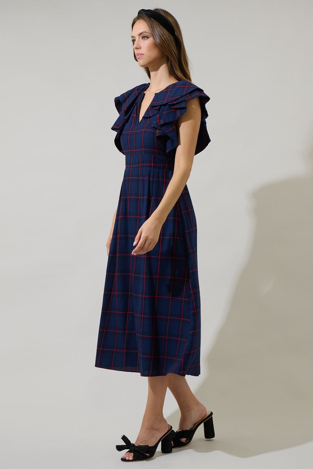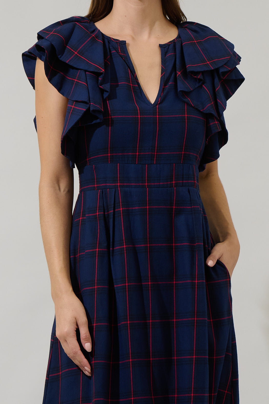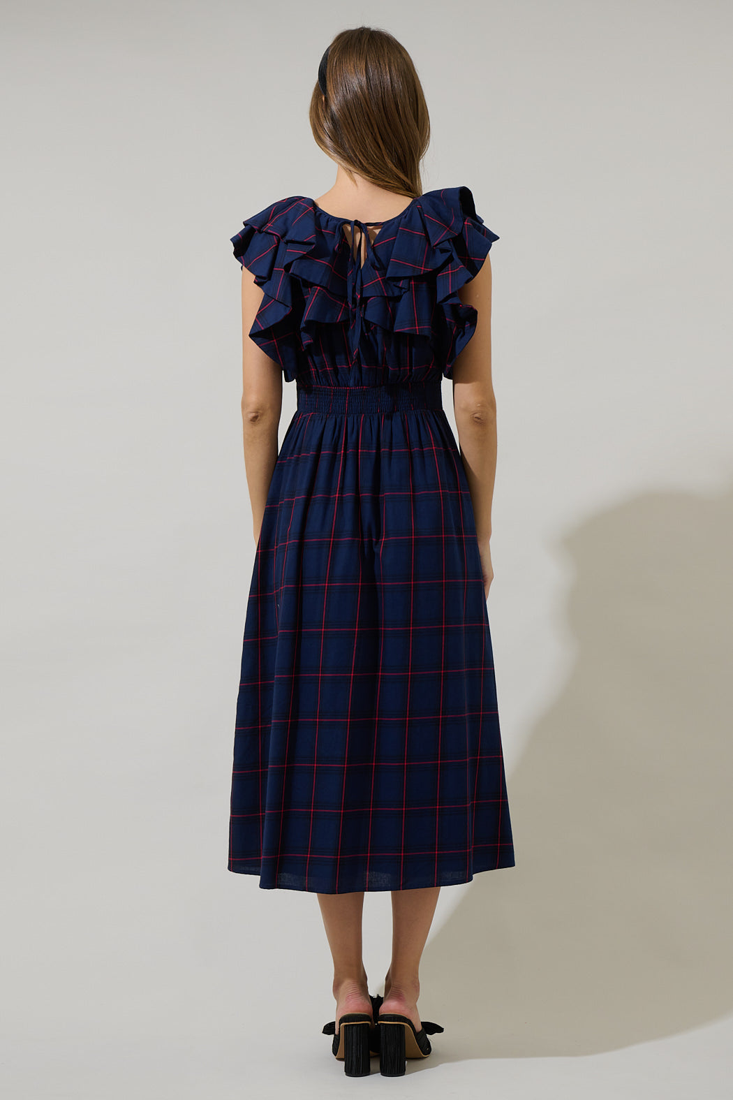 Everyone will adore your look when you style the Holbrook Plaid Santana Tie Back Midi Dress. Ruffle layered cap sleeves take the spotlight, joining a split neckline and maintaining a sheath style silhouette with pleats along the waistline. A tie back detail holds the dress together, while a smocked waist at back adds shape. Wear it with strappy heels and loose waves for a finished look.