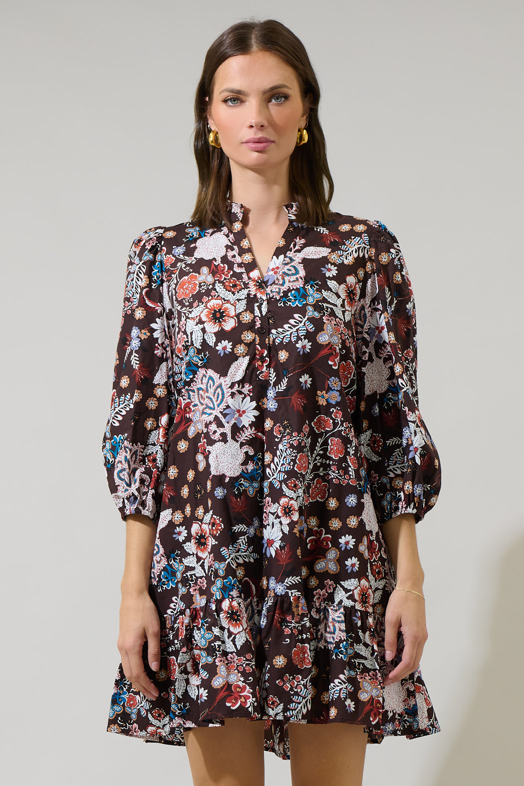 Introducing the Journee Floral Jazlyn Split Neck Mini Dress, with an outstanding floral print. It features long balloon sleeves, a ruffle neck, and a button front. It also has a belt rope around the waist and ends in a mini ruffle hem. Wear the dress with your favorite white heels and jewelry.