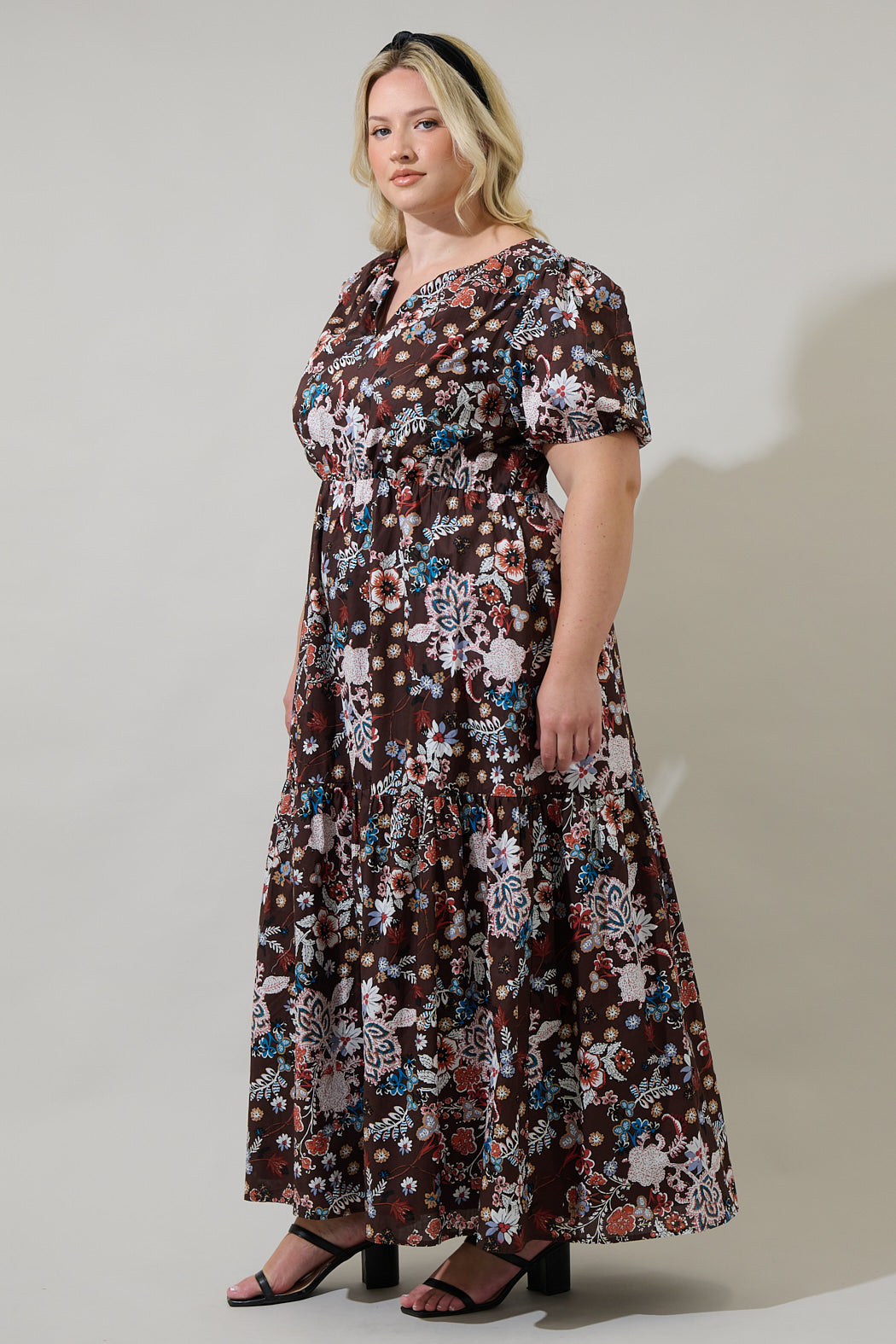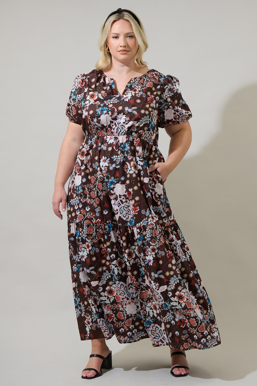 For a next-level look simply wear this lovely Journee Floral Morty Puff Sleeve Maxi Dress, with a brown background and multi white florals throughout. Short sleeves puff sleeves frame a split neckline, and a stretchy, thin waistband. The full maxi length is perfect to wear with short heels.