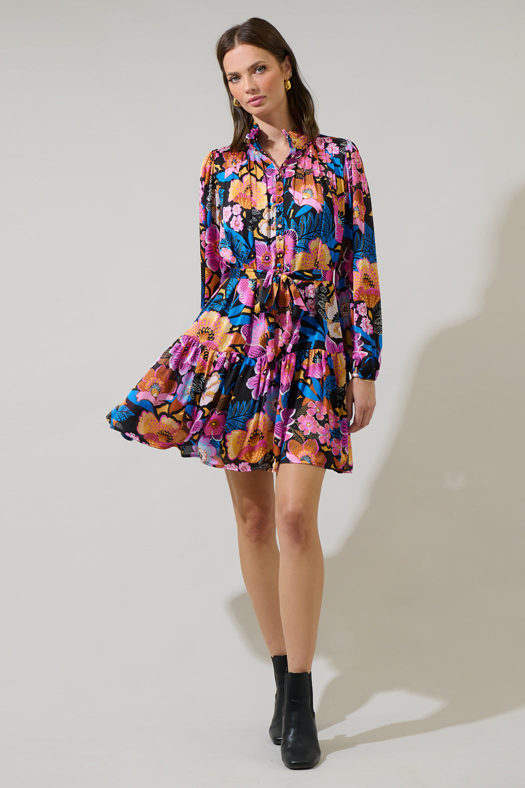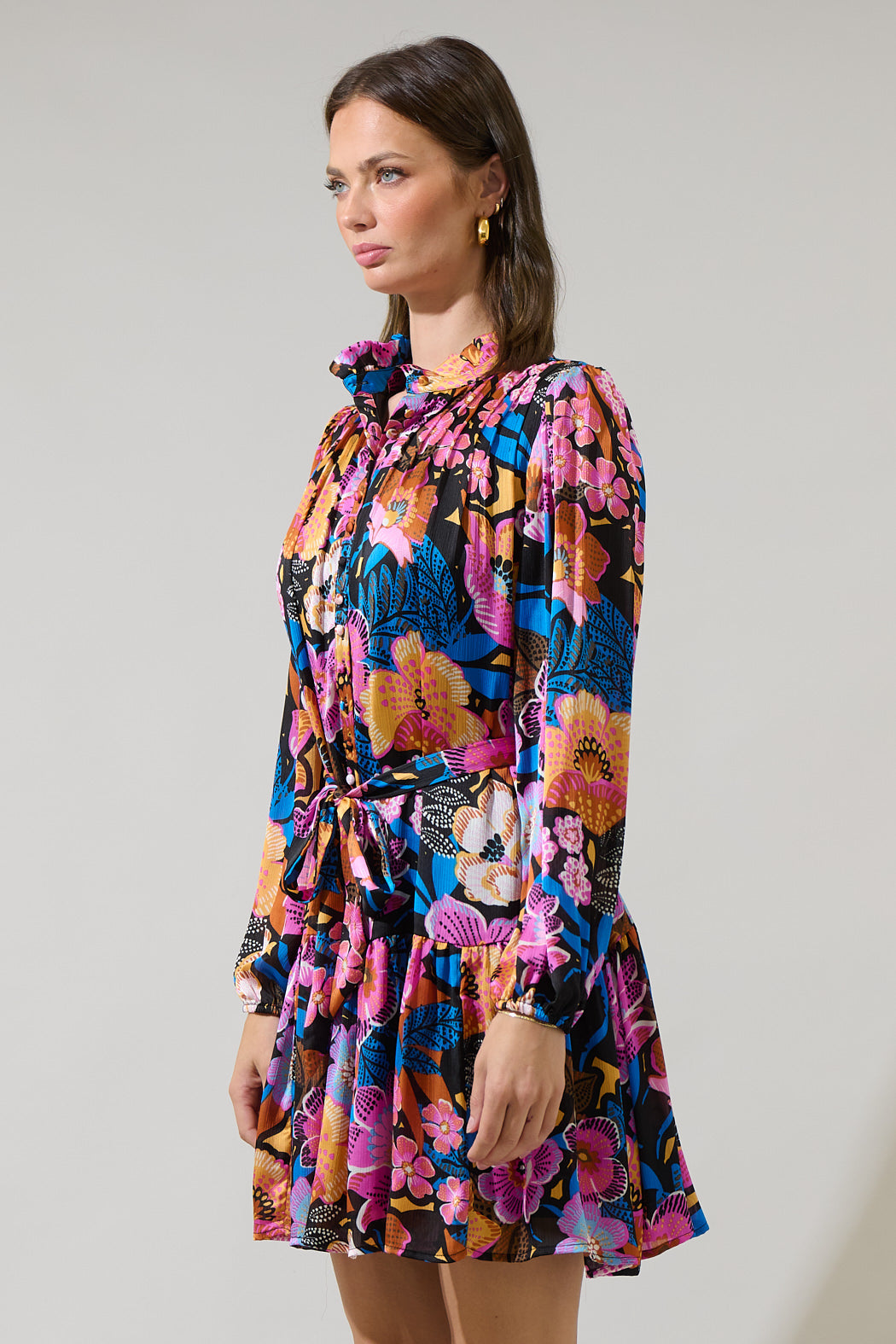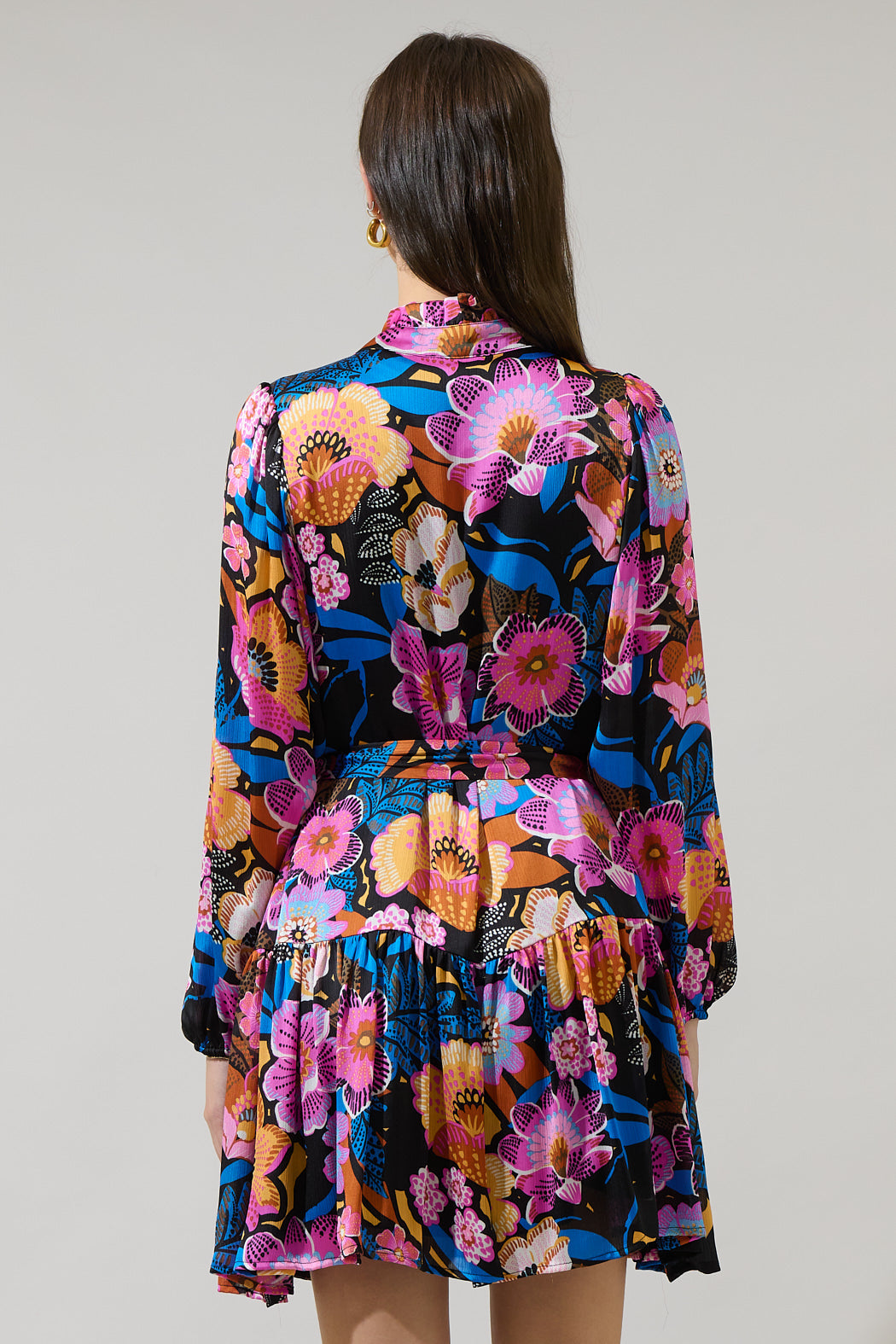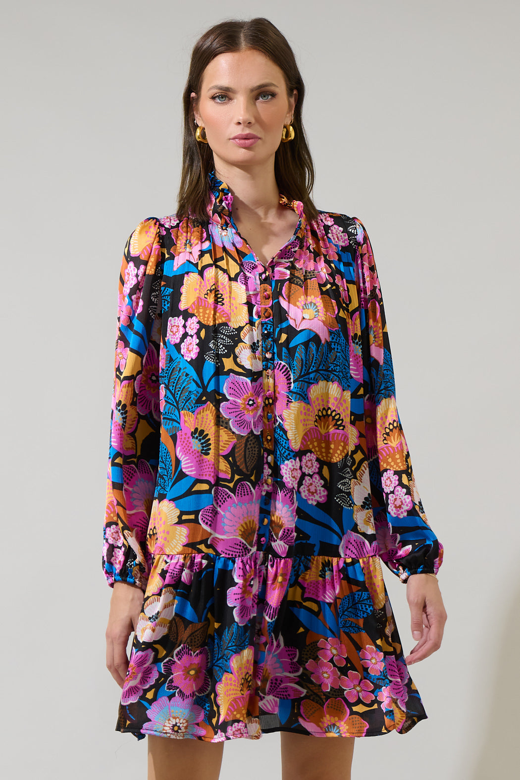 The Kadence Floral Groover Button Up Mini Dress will have you lookin' extra cute! This sleek multi color floral satin shapes long sleeves and elasticized cuffs, pintucks at the bodice with a cute button design, and a ruffle mock neck. Wear it with strappy heels to and show off your look.