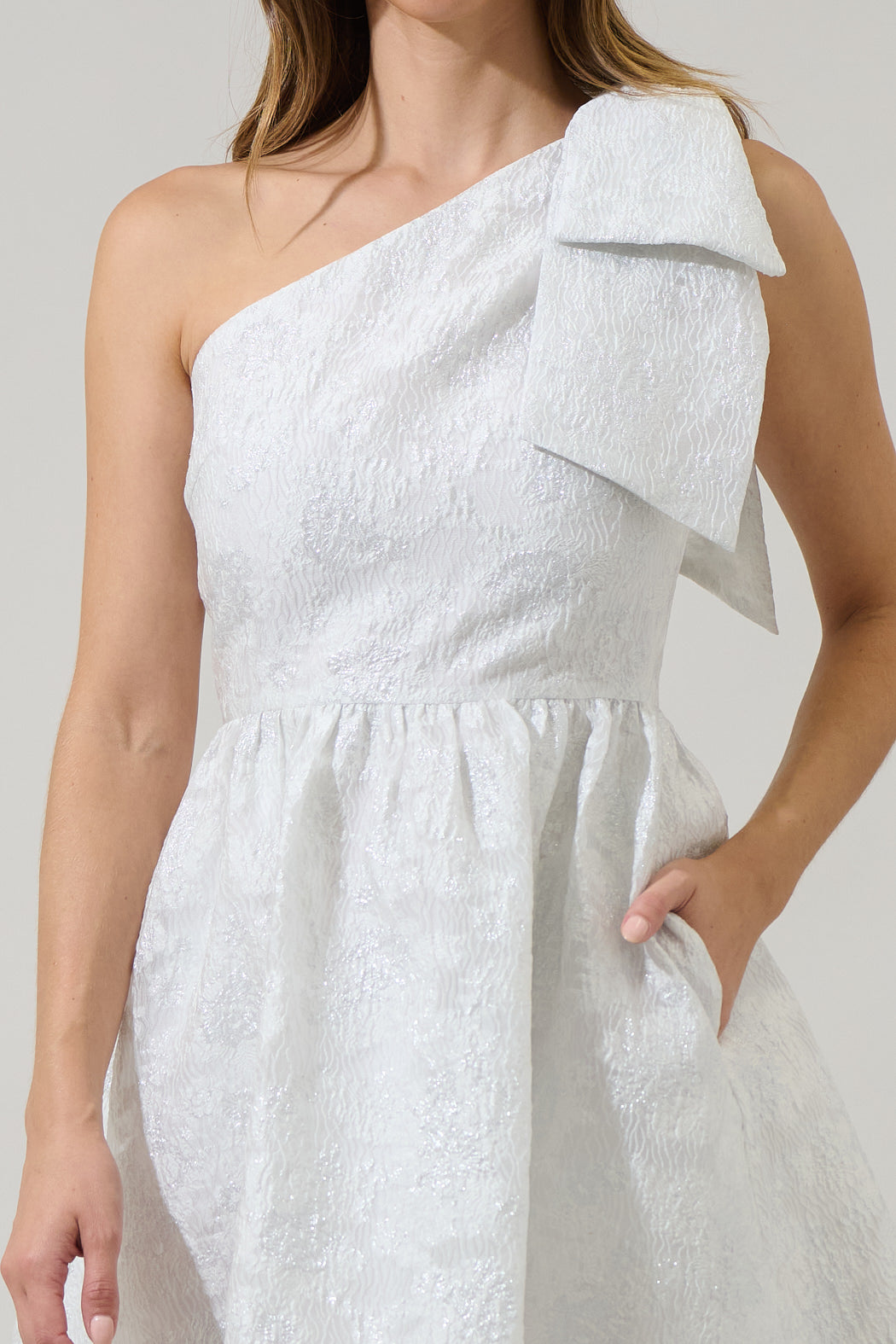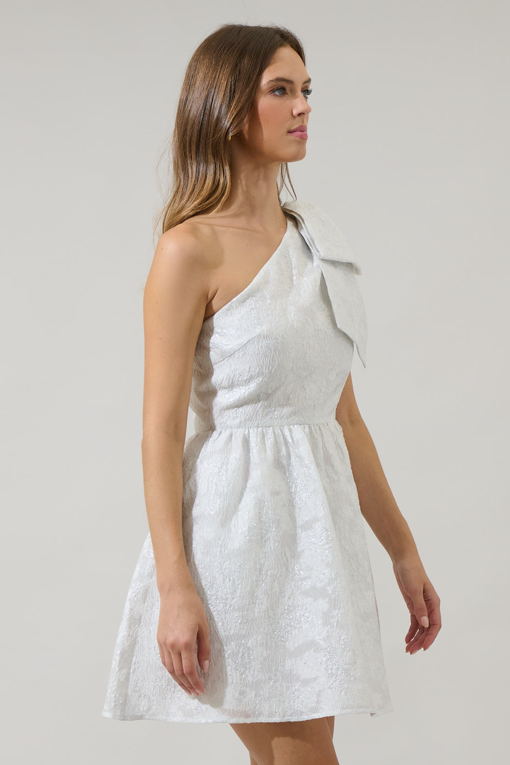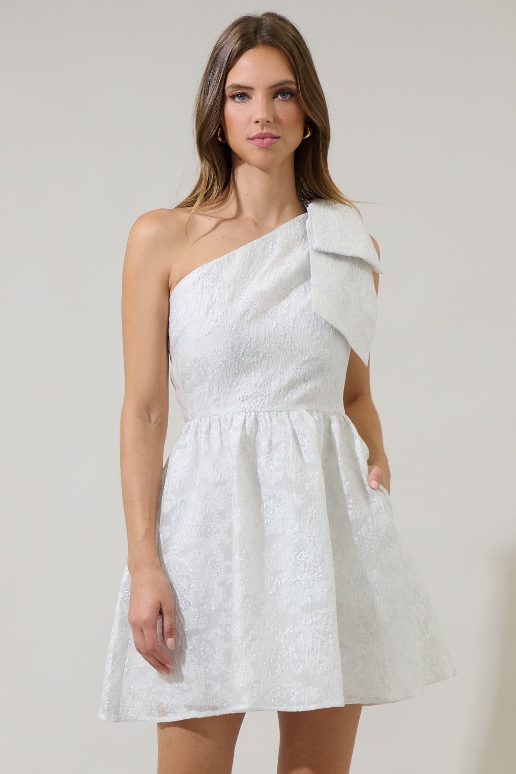 There's no end to our love for the Kanosh Jacquard Ivine Bow Mini Dress. A jacquard floral print designs this one shoulder dress with a big bow at the shoulder. The bottom is flared with an invisible zipper on the side. Add on your favorite heels to create a full look.