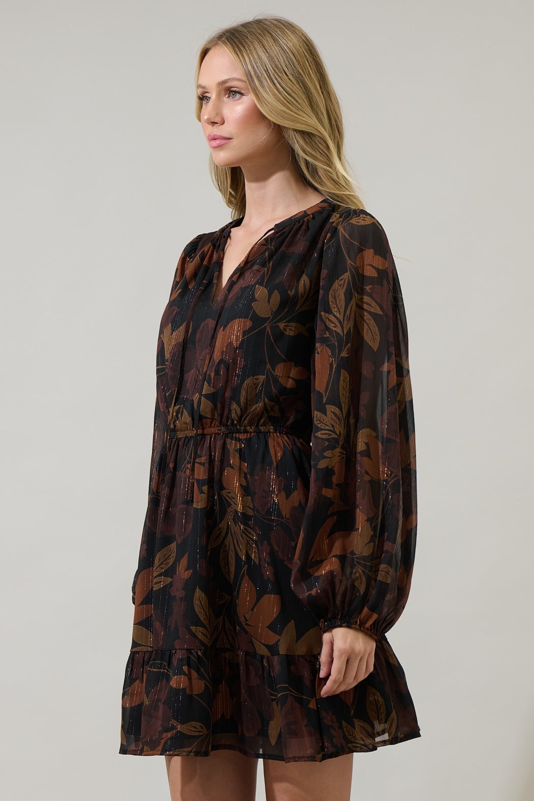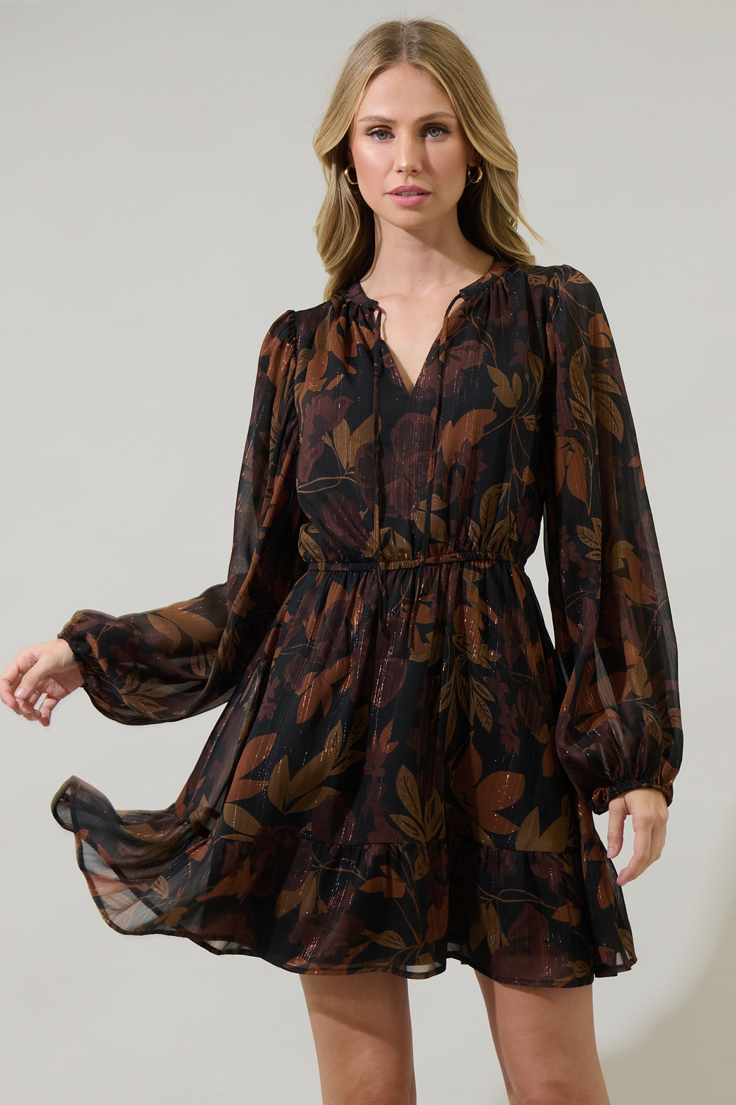 You'll be looking beyond gorgeous in the Larba Floral Paxton Balloon Sleeve Mini Dress. It features a split neckline with a tie detail that's framed by sheer, long balloon sleeves. An elastic band at the waist creates shape, topping a gathered flowy single tier skirt. Pair it with strappy heels and a black matching bag.