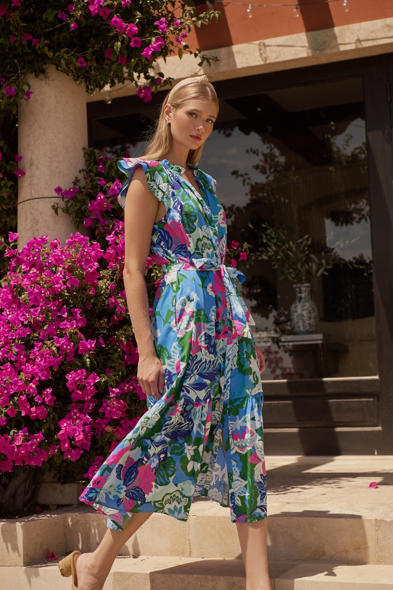 Get ready to be admired for looking good in the Lavera Floral Charlotte Button Midi Dress. It features a split neckline and a flare bodice, framed by short cap sleeves. A belt wrap around the waist and secure at the back, followed by a button-down design. Pair it up with sandals and a summer hat.