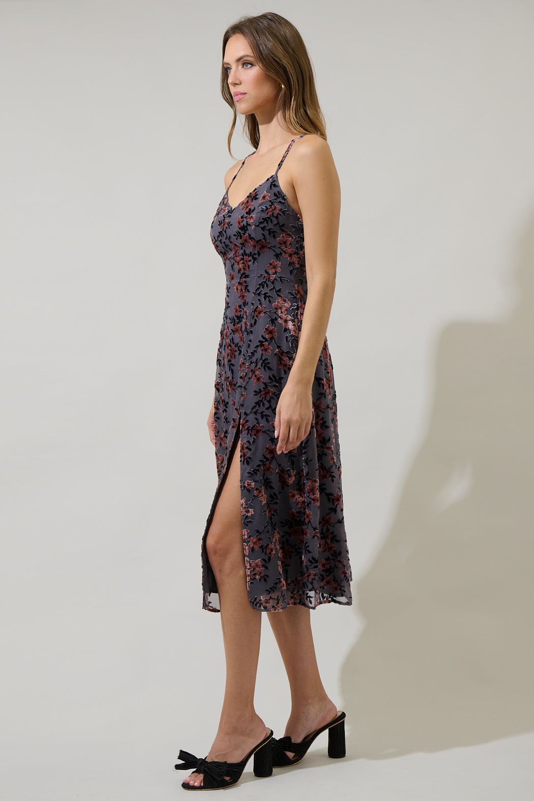 Enjoy your night out in this floral midi dress with adjustable spaghetti straps that join a V neckline. A shapely fit is maintained throughout the bodice and waist and widens at the hips to create a flowy skirt. A teasing side slit adds a flirty touch, as does the open back with criss cross straps. Pair the look with any heels of your choice.