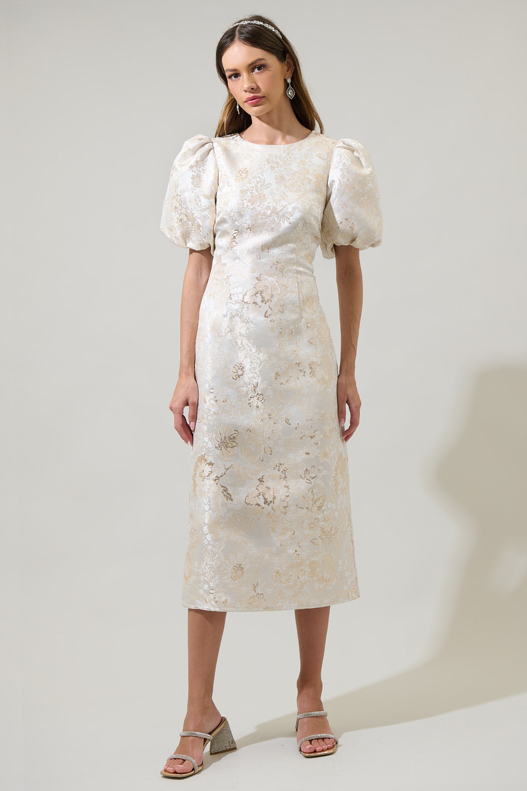 Let’s make a toast to the Lola Jacquard Cut Out Midi Dress. Sleek woven satin fabric, with a floral jacquard design throughout, shapes this dress with short bubble sleeves and a cowl neckline. It has a back cut out design that ends with a bottom slit. Wear this dress for any occasion.