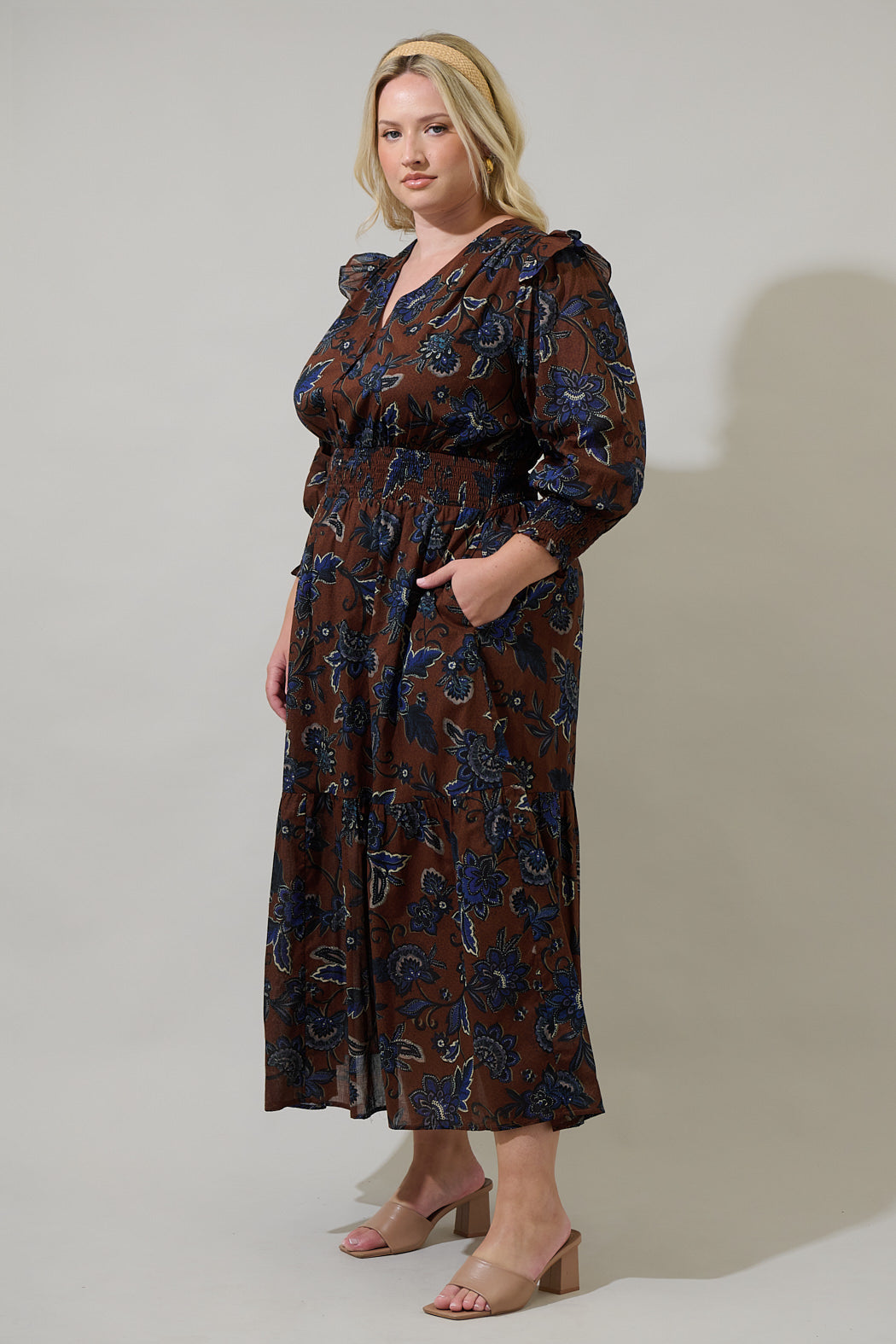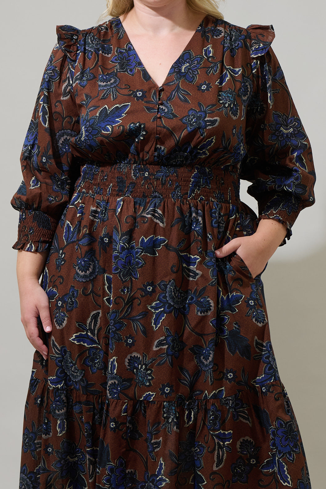 The Marlina Floral Norma Long Sleeve Midi Dress will help you be ready in no time. A lovely brown and blue floral print create long sleeves with ruffles at the shoulders and smocked cuffs. It has a button up v-neckline that leads to a smocked waistband. Pockets on each side make it very convenient. Pair the look with brown heels to match.