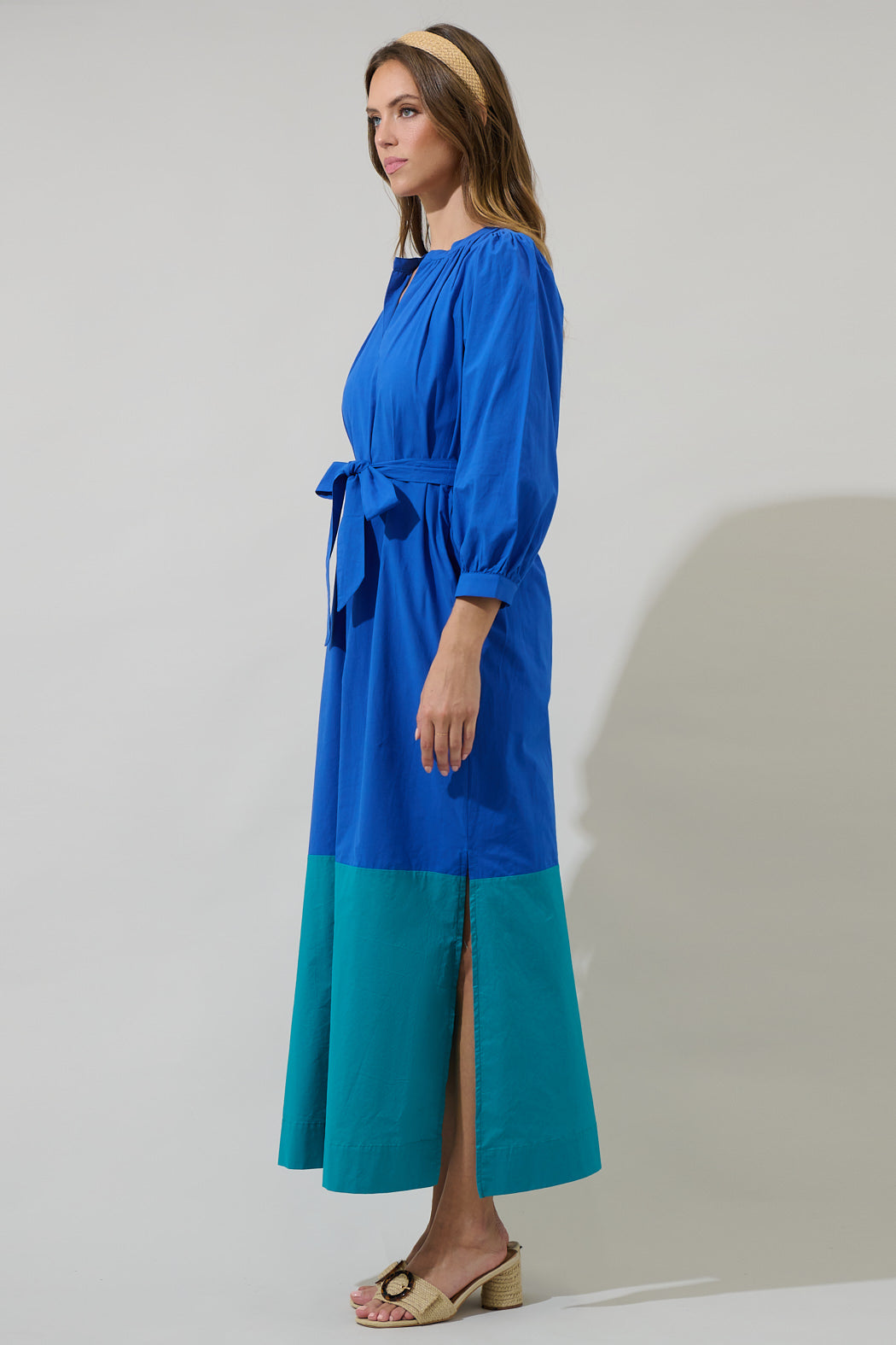 Step into effortless elegance with the Mayfield Bay Color Block Maxi Dress. Long sleeves frame a split neckline, creating small pleats around. It is full length and has a color block design to elevate your everyday style with ease. Wear it with matching heels to go along.
