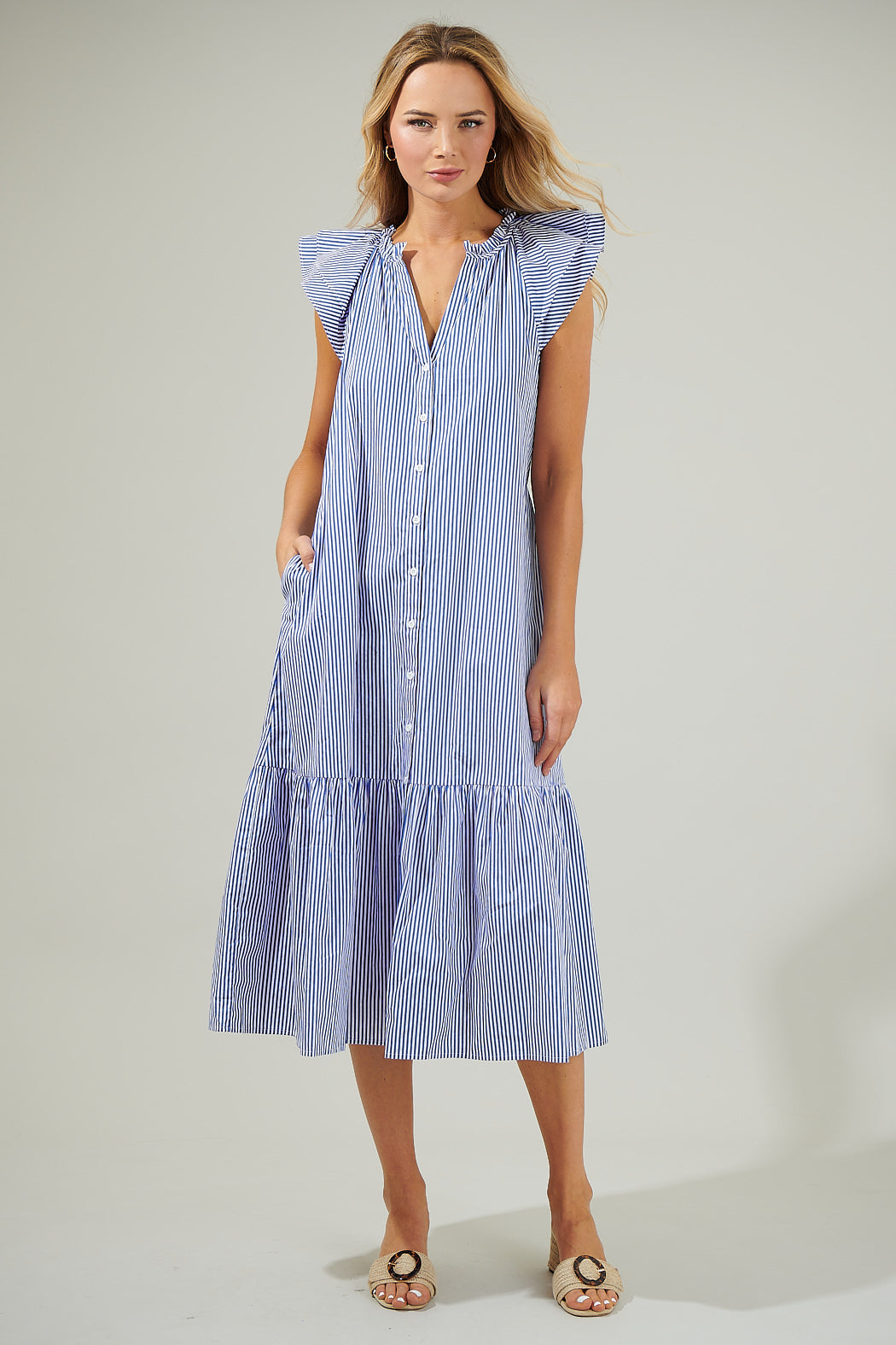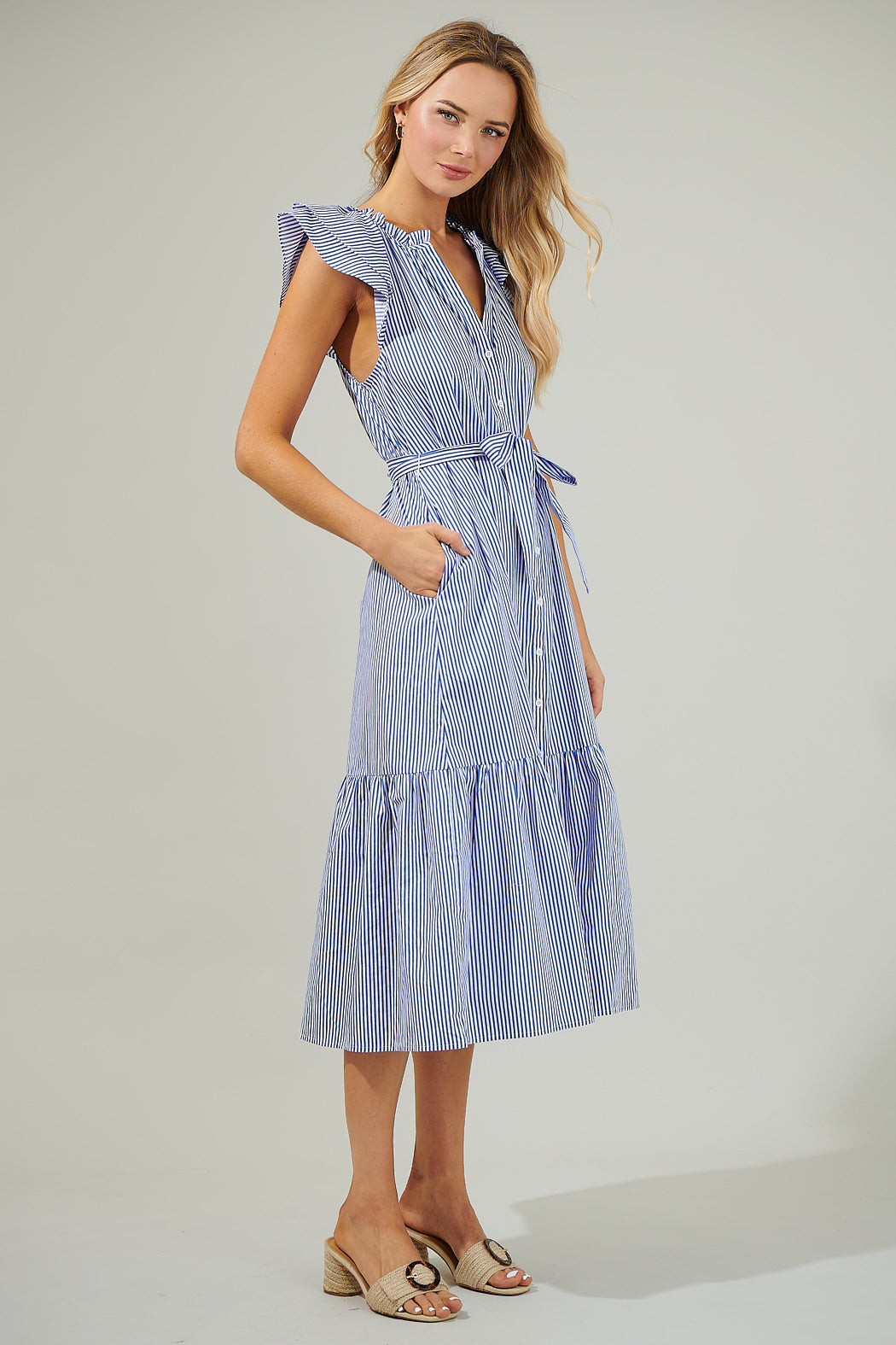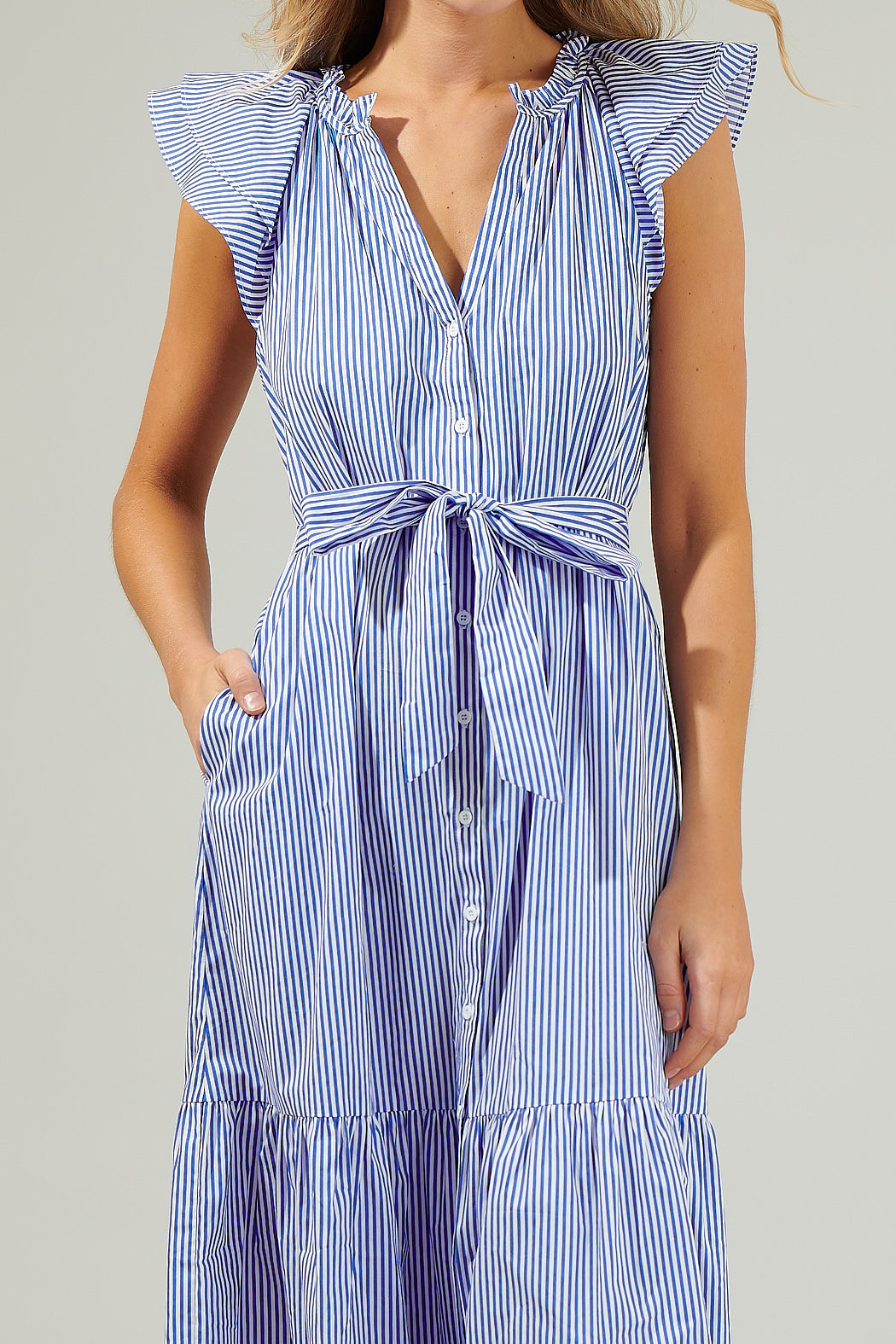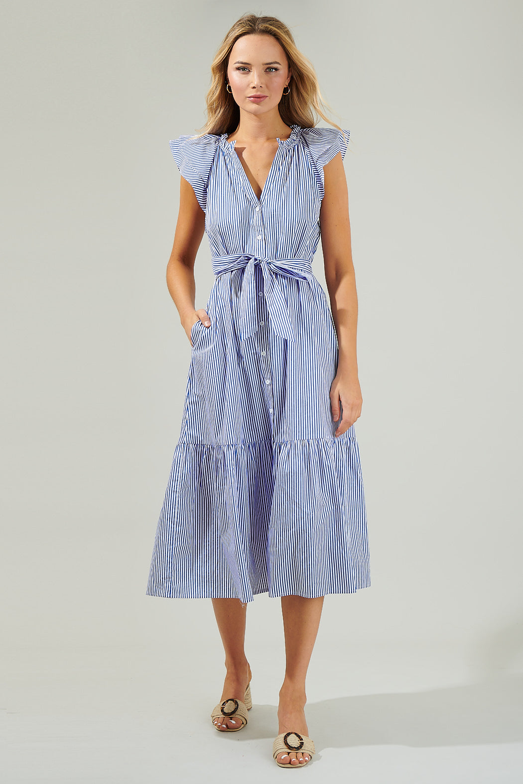 Imagine yourself looking absolutely stunning with the Sherah Striped Charlotte Button Midi Dress! This summer day-ready dress that features a split neckline and a flare bodice, framed by short cap sleeves. A belt wrap around the waist and secure at the back, followed by a button-down design. Don’t forget to bring your summer hat along!
