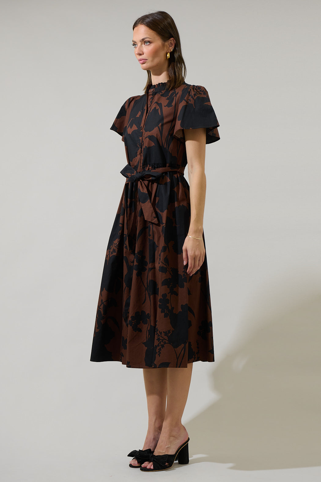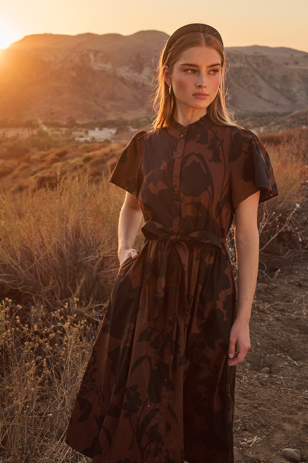 Sweet and stylish come together to form the Somerton Floral Aurelia Babydoll Midi Dress. It forms a mock neck with button up closure detail from top to bottom, and short sleeves. A belt around the waist tops a flowy skirt that flows to a modest midi length. Pair with any shoes of your choice and simple accessories.