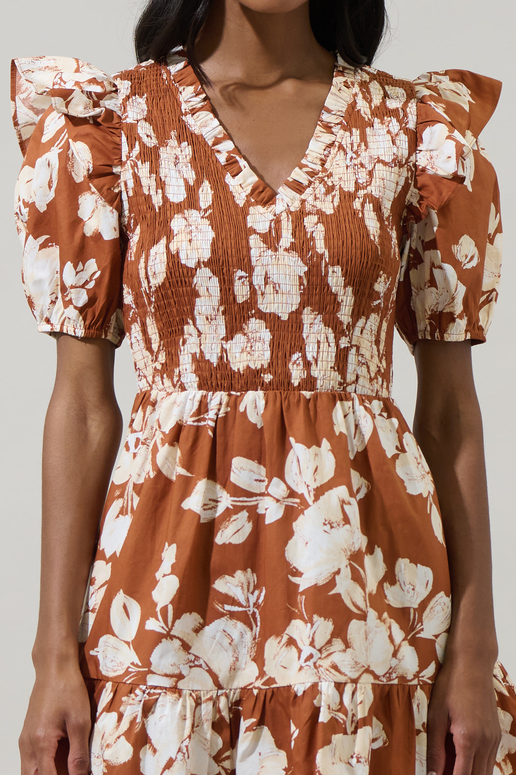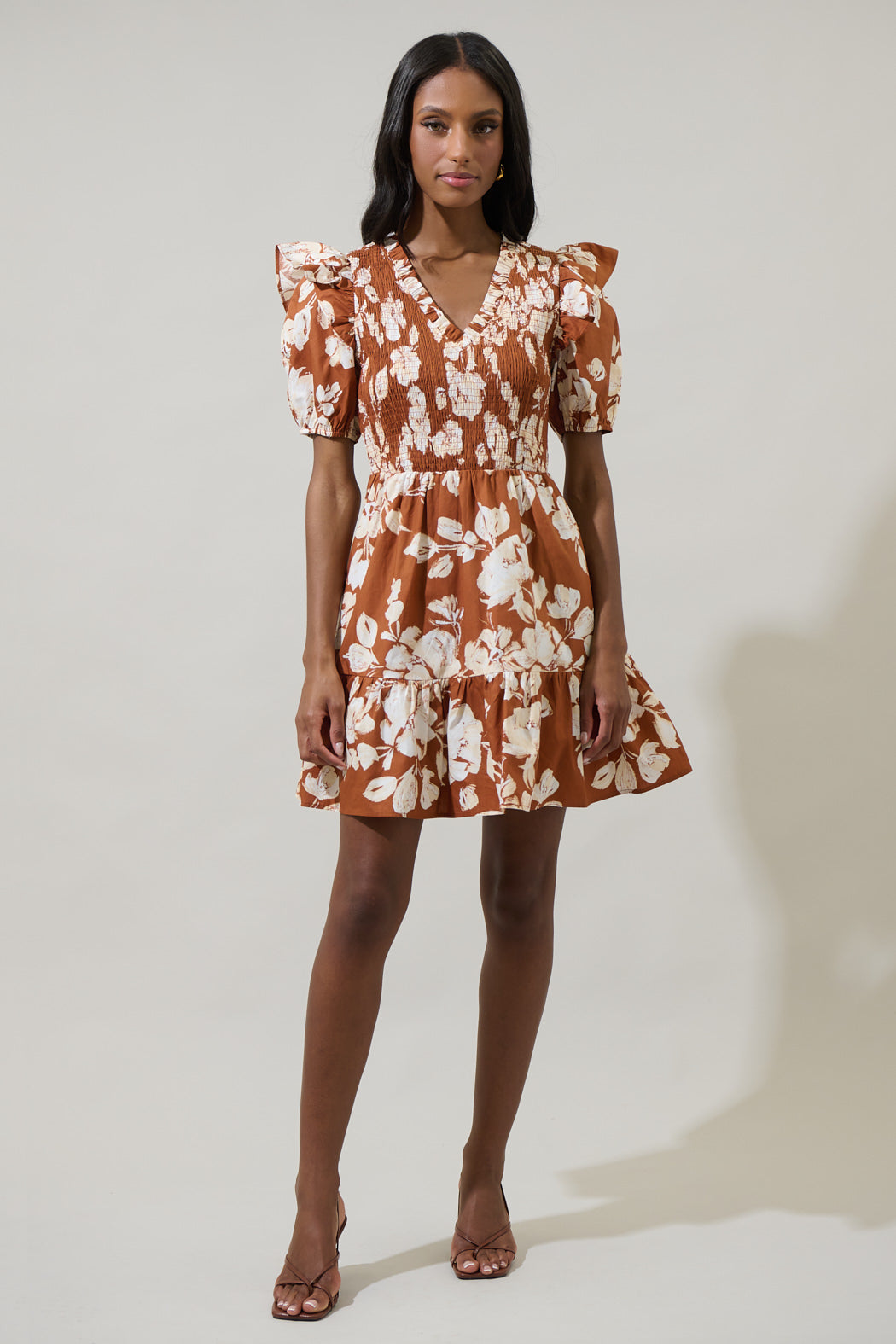 The dress for your next brunch date is our lovely Surrey Floral Leones Smocked Mini Dress. A white floral print sits on brown background with cotton fabric. Features a ruffle trim V neckline and fully smocked bodice framed by short puff sleeves. It tops a flared ruffle tier mini skirt. Wear it white loafers and gold accessories.