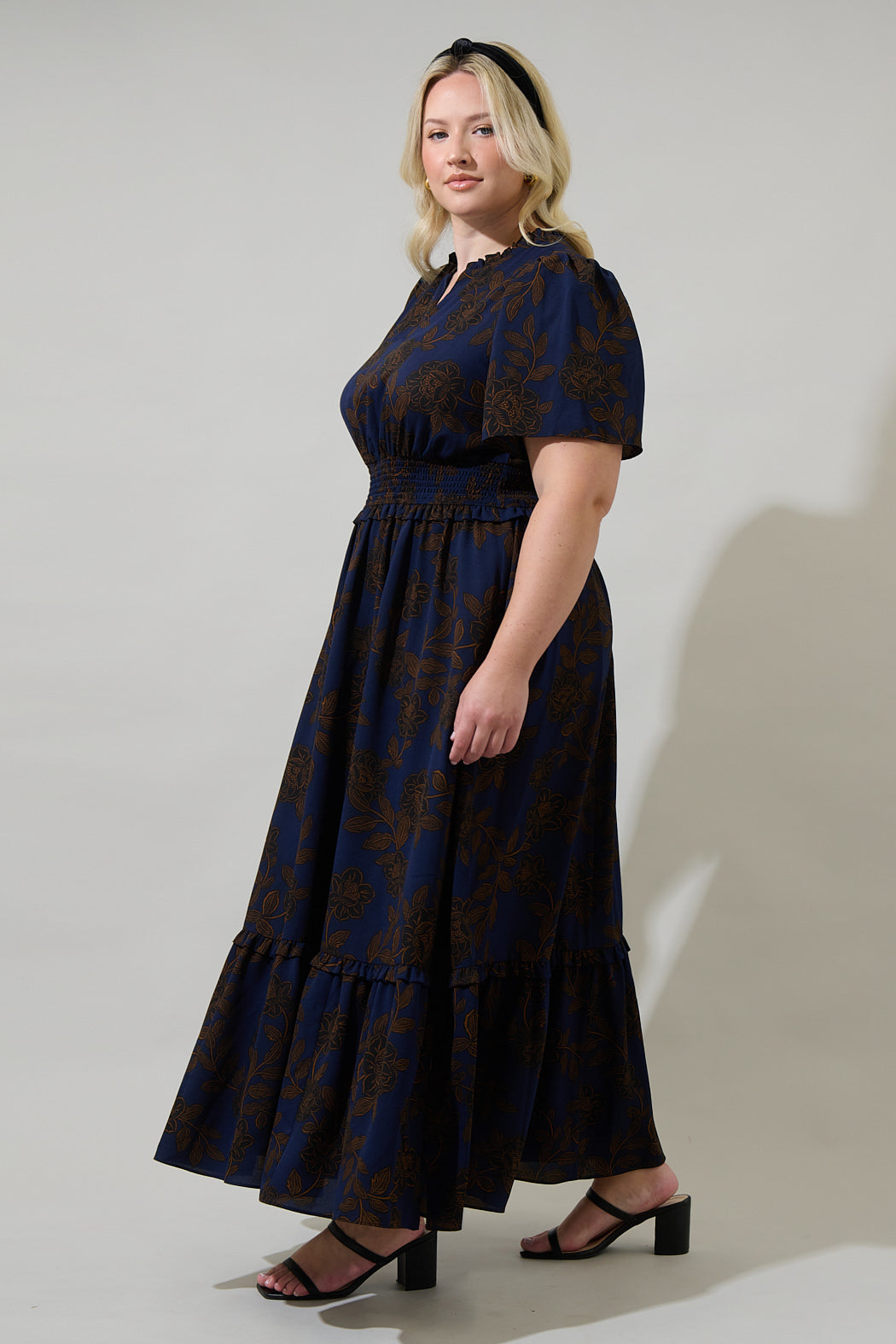 We can’t go wrong with autumn tones. This maxi dress features a brown floral design on a dark blue background. It has a split neckline, short flutter sleeves, and a smocked waist band with ruffles. Pair it with strappy heels and simple jewelry.