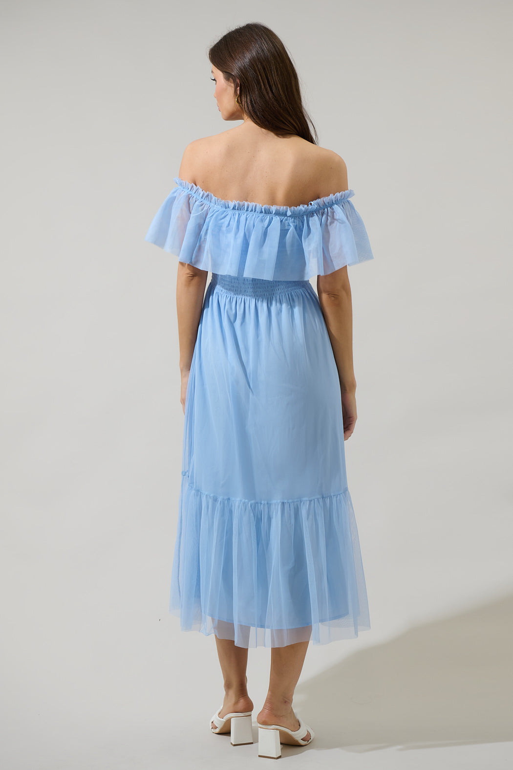 Make room in your closet for this Trace Tulle Off the Shoulder Midi Dress. This dress is featured in a trendy tulle fabric with a ruffle off the shoulder, and smocked bodice. Pair with ankle strap heels and a clutch for an everlasting look.