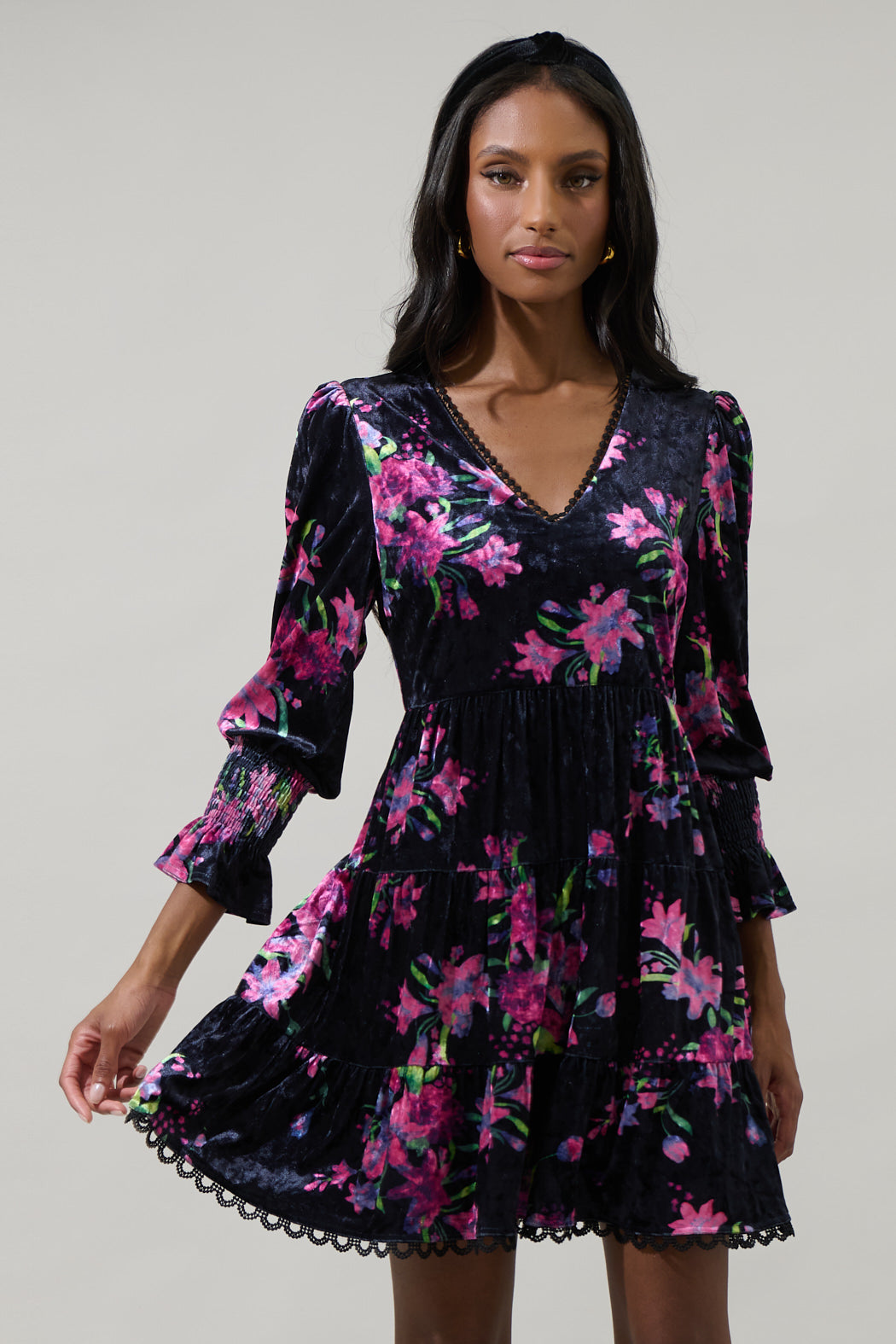You're going to look oh so sweet in the Tulda Floral Amari Velvet Tiered Mini Dress. A beautiful pink floral print enchants this long sleeve dress with smocked cuffs, V-neck and tiered layers. Wear it with fuchsia heels to complete a look.