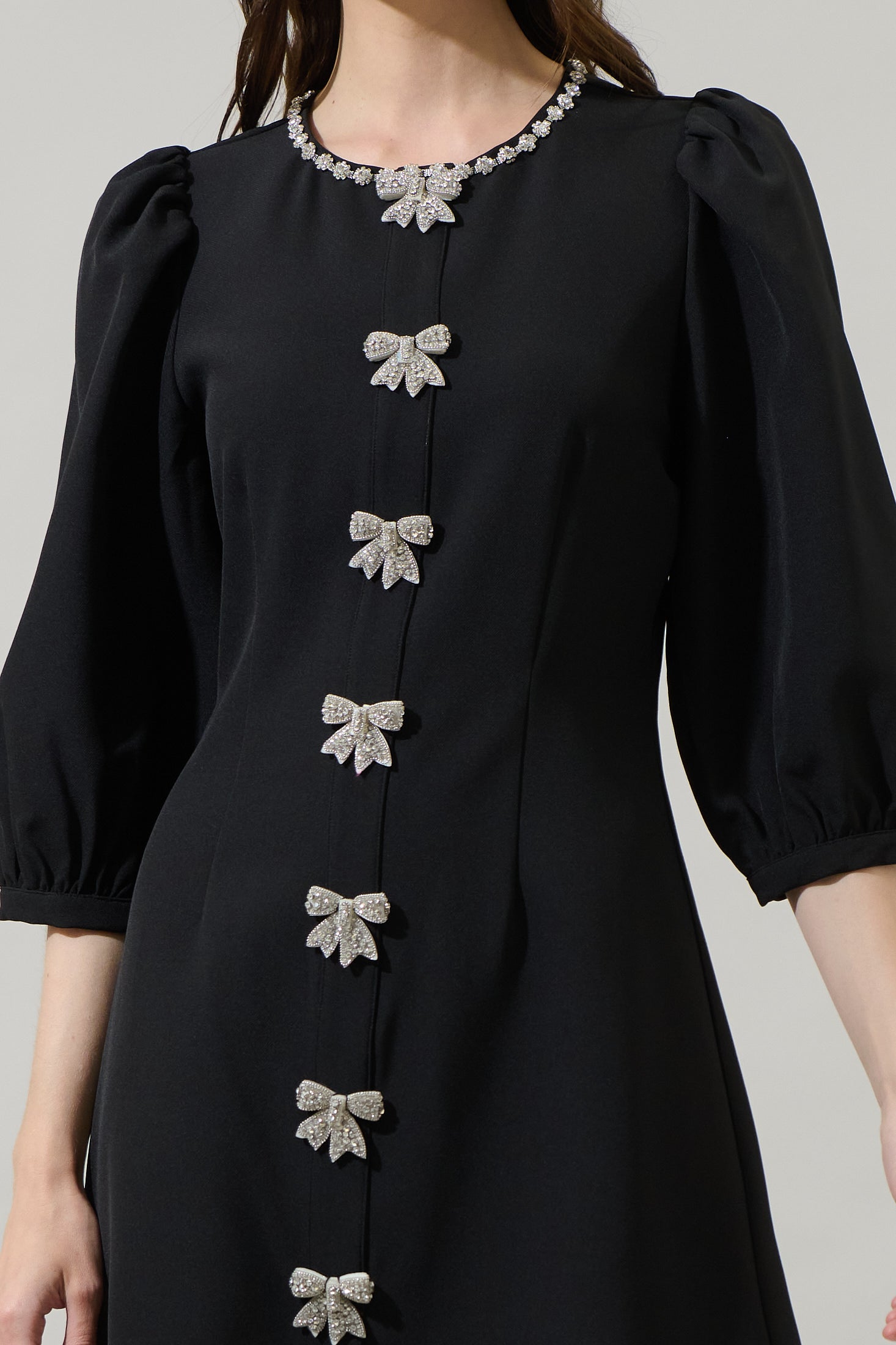 This modern mini dress is what your closet needs this season! Half bubble sleeves frame a round neckline. The front has a button up placket with rhinestone bows as buttons. The neck has rhinestones on the border. Pair it up with heels or mules for a cute look.