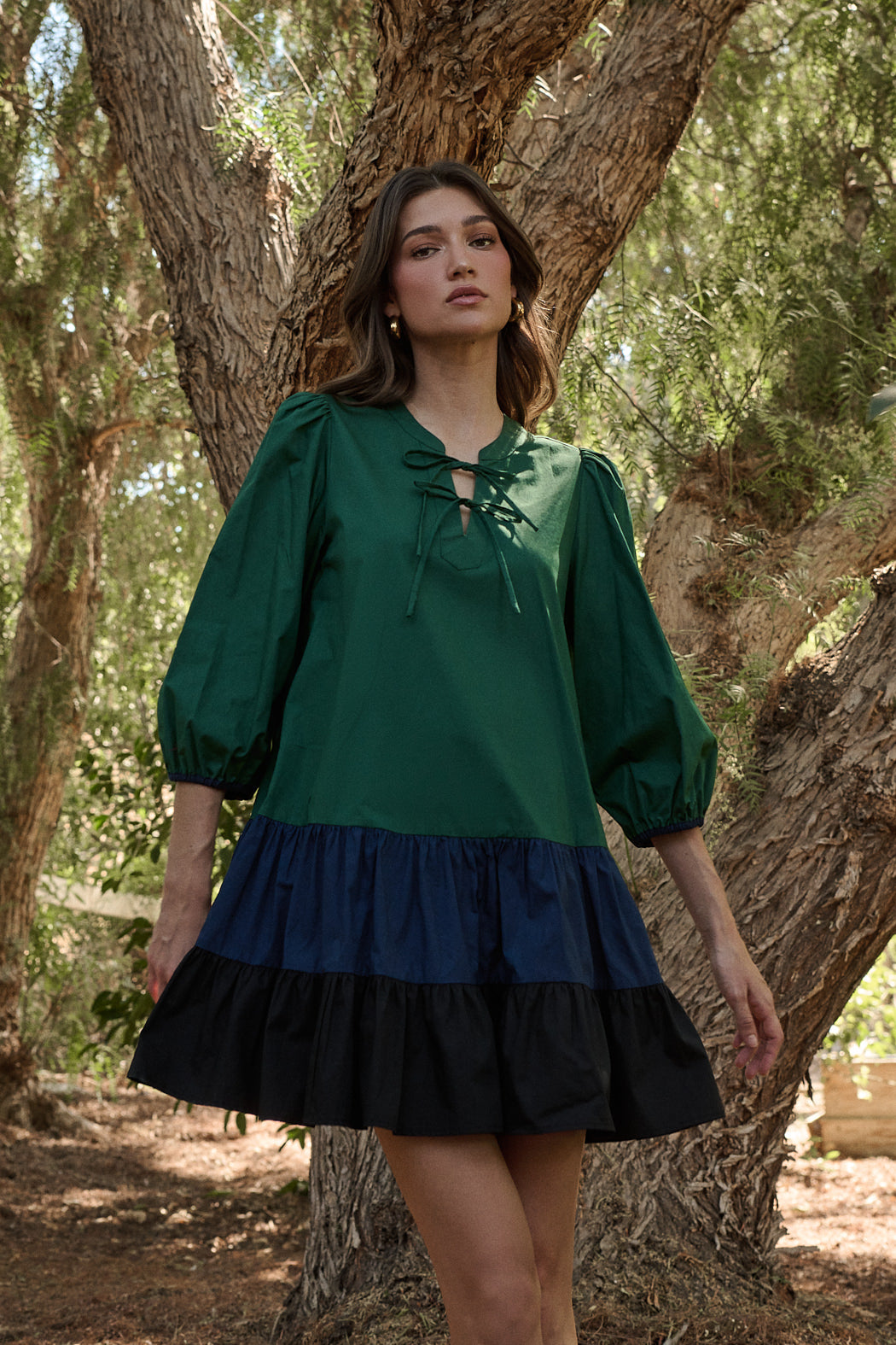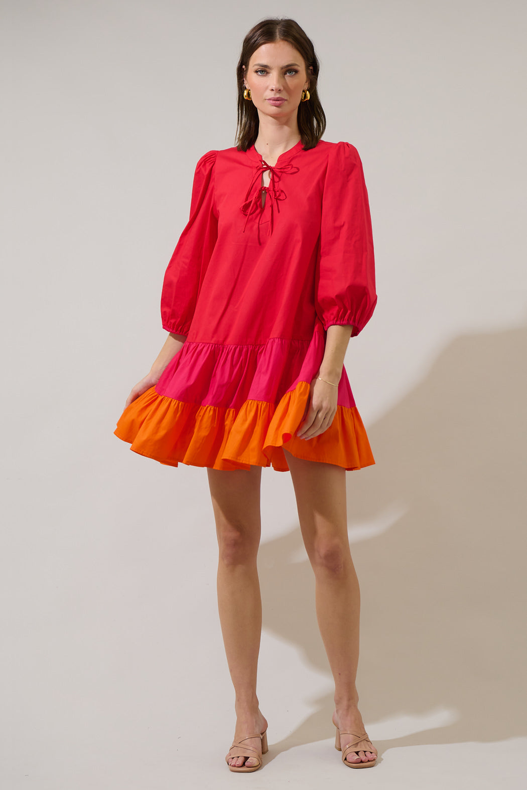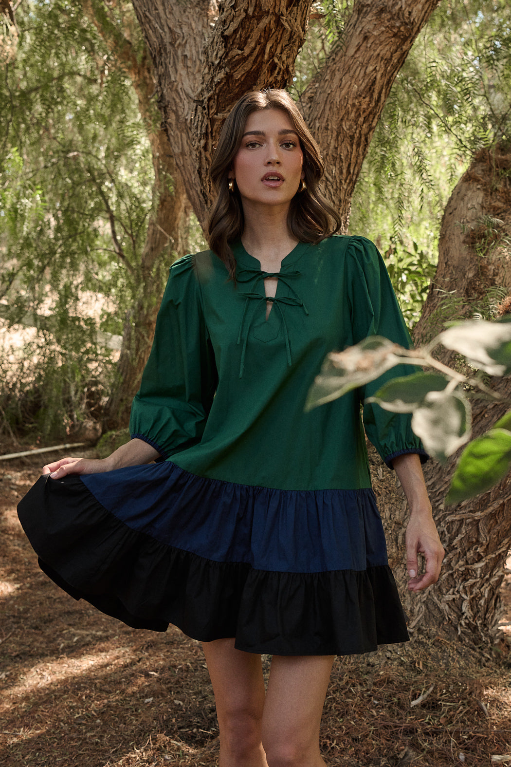 Stroll around under the sun with the Woodlake Color Block Tiered Mini Dress. Long sleeves with elastic cuffs feature a split neckline with string ties. It has a low waist with tiered layers. Pair it with cute sandals or wedges for an easy comfy look.
