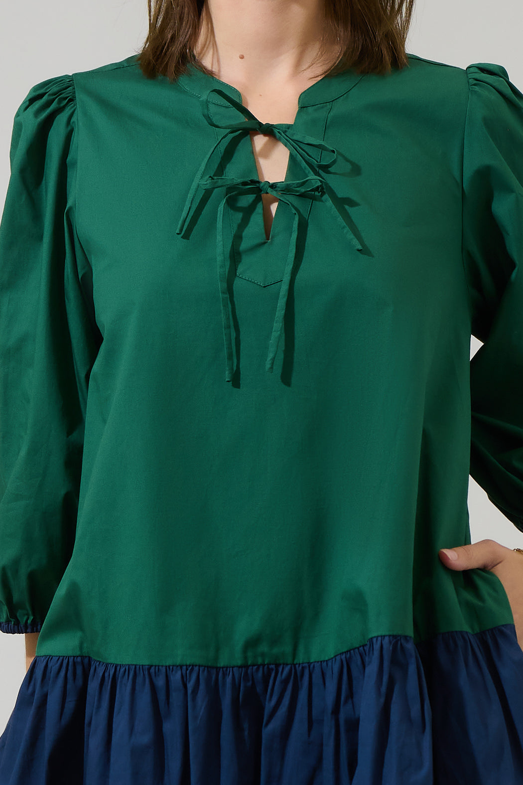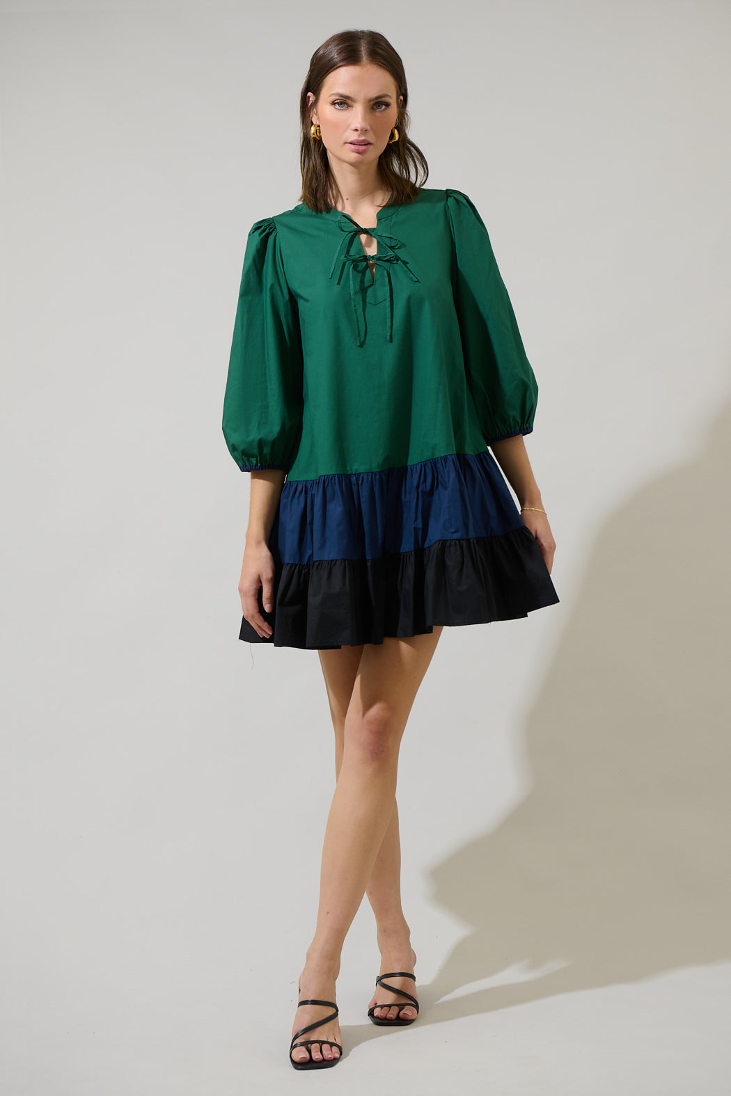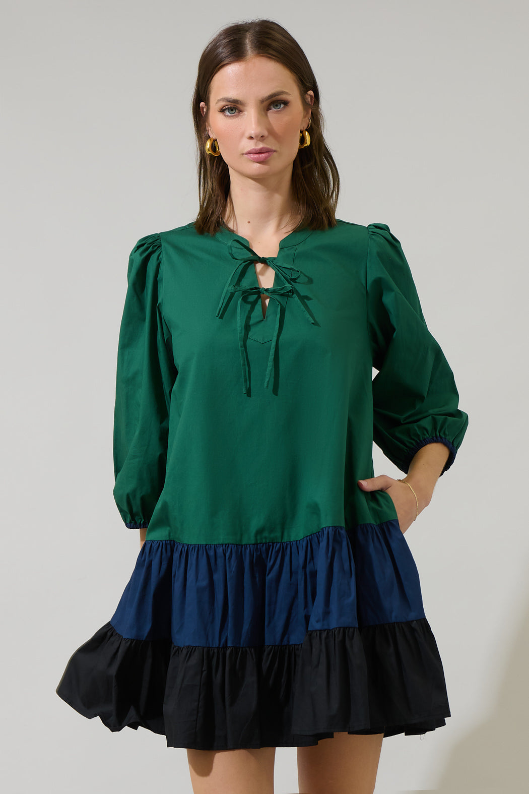 Stroll around under the sun with the Woodlake Color Block Tiered Mini Dress. Long sleeves with elastic cuffs feature a split neckline with string ties. It has a low waist with tiered layers. Pair it with cute sandals or wedges for an easy comfy look.