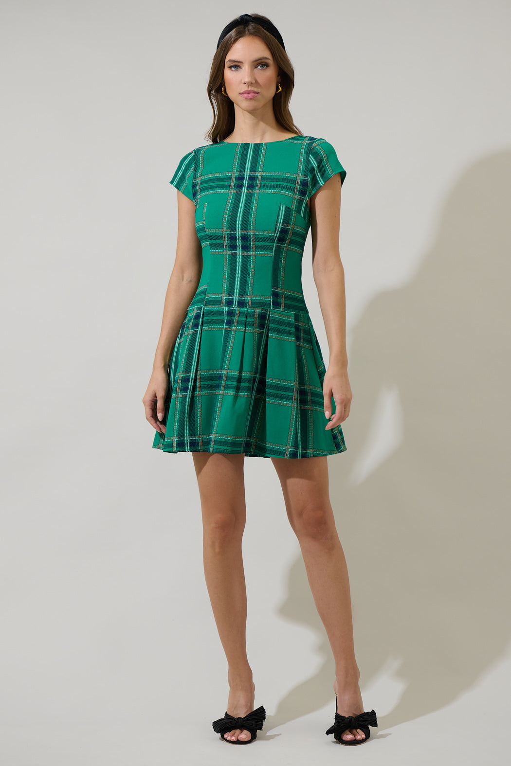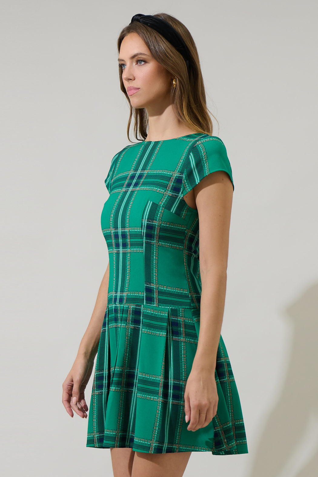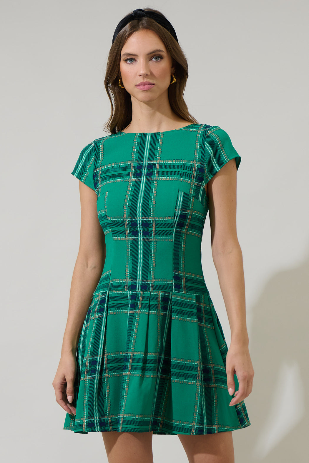 Head out the door looking so cute in the Woodland Jade Mali Pleated Mini Dress. Short sleeves frame a round neckline with unique plaid pattern throughout. The skirt has pleats and the back is open and has a tying bow. Wear it for casual outings as the seasons transition with booties or mules.
