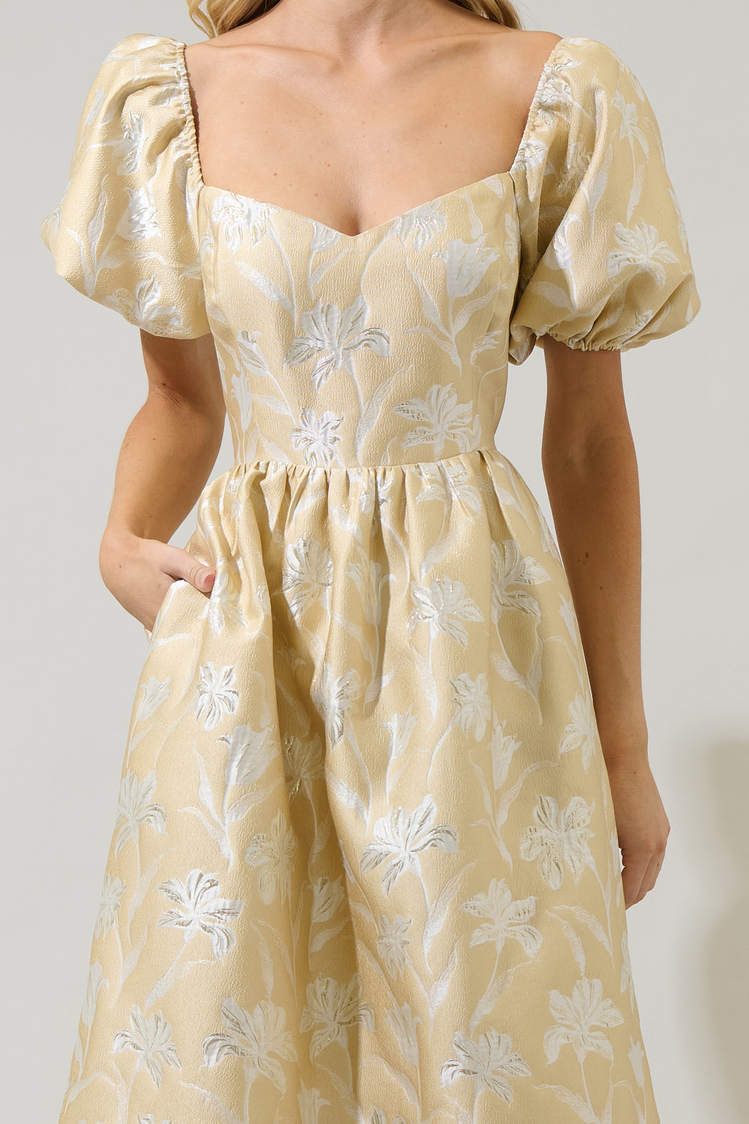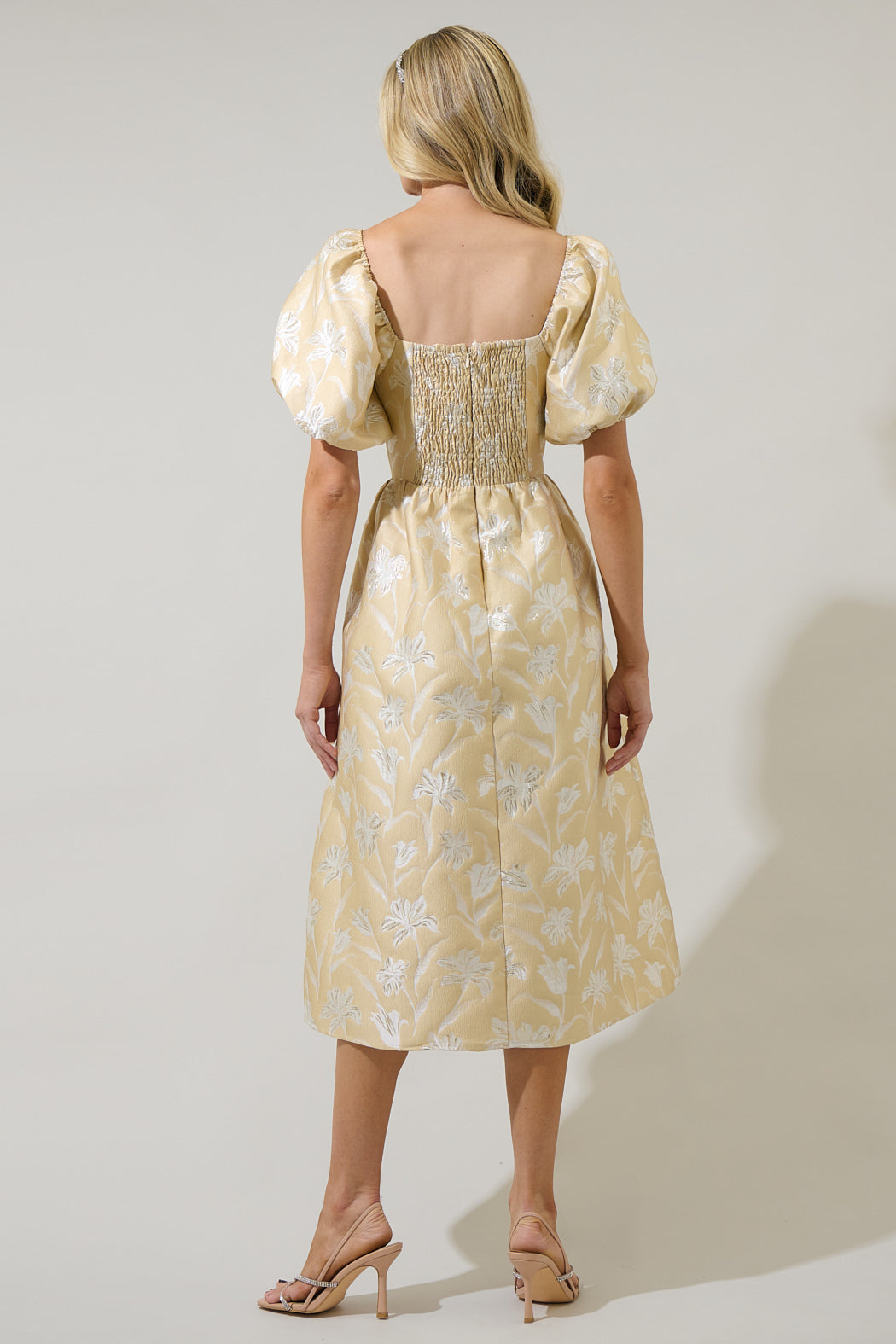 Catch all eyes on you, when you wear the Zarah Jacquard Alessi Puff Sleeve Midi Dress. This romantic dress features short puff sleeves that frame a sweetheart neckline and a fitted bodice with princess seams for a shapely fit. A smocked back and invisible zipper allow for easy mobility, as well as a flowy A line skirt. Complete the look with open toe heels.
