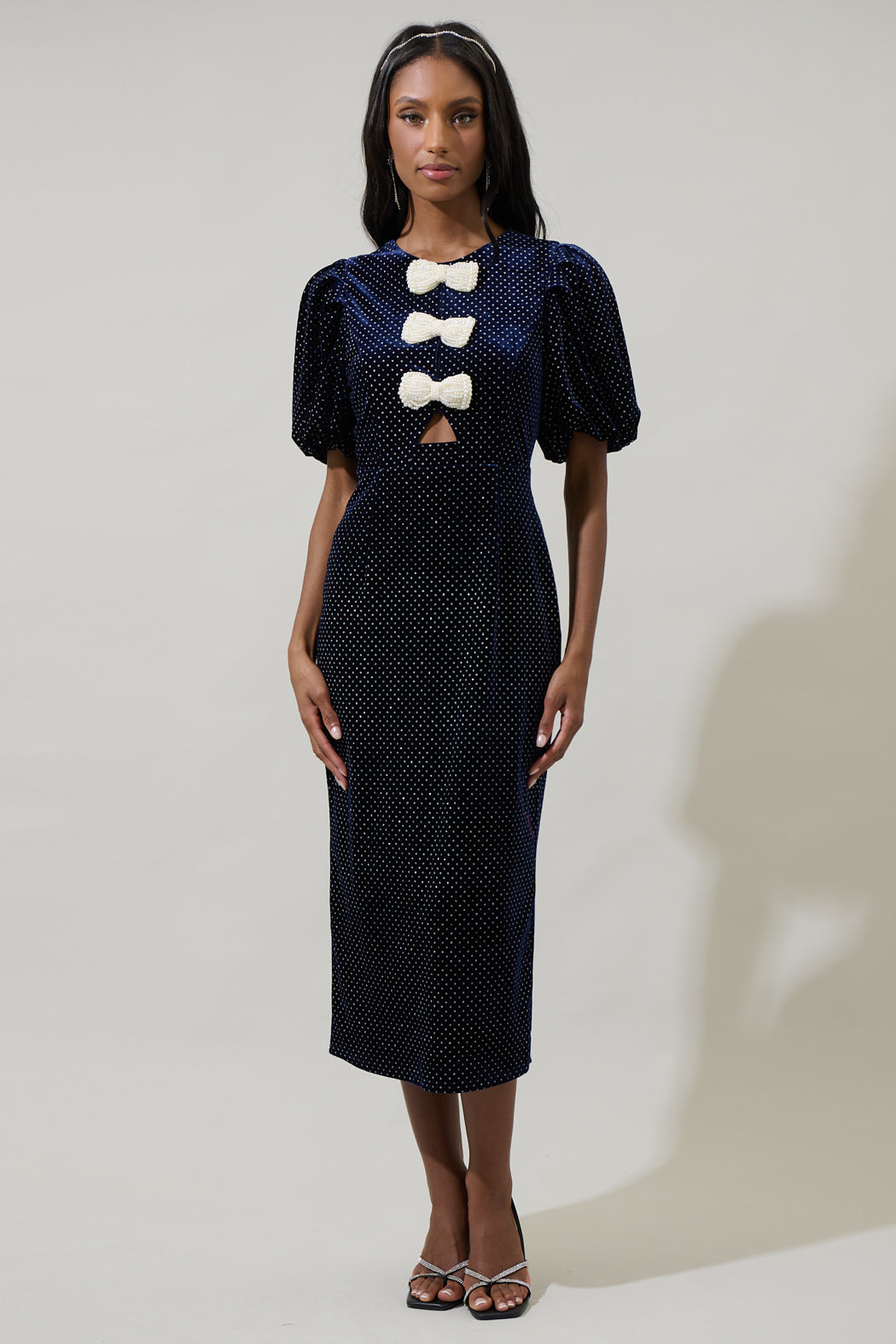 Nelly Dot Velvet Pearl Bow Midi Dress